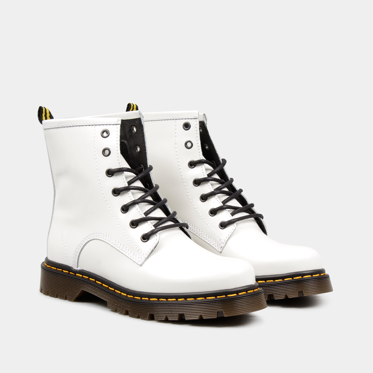 Bota em pele polida na cor preta com pormenores em amarelo, sola robusta, cordão e fecho.