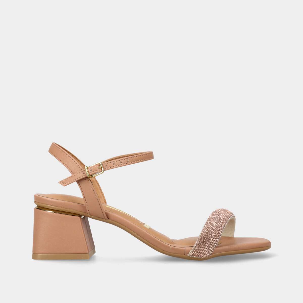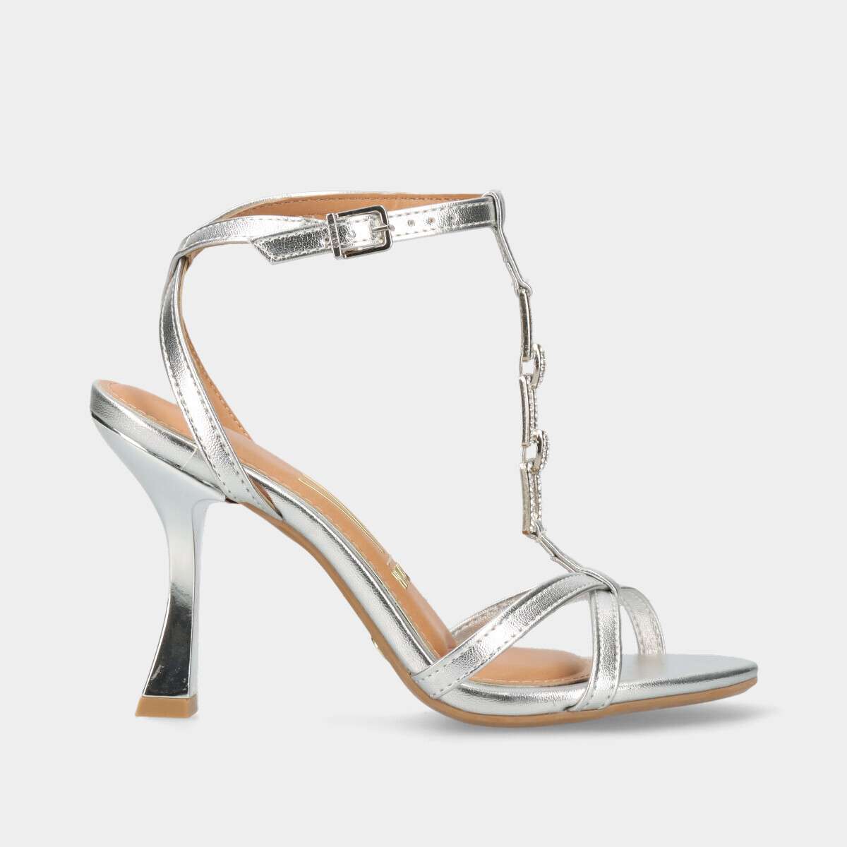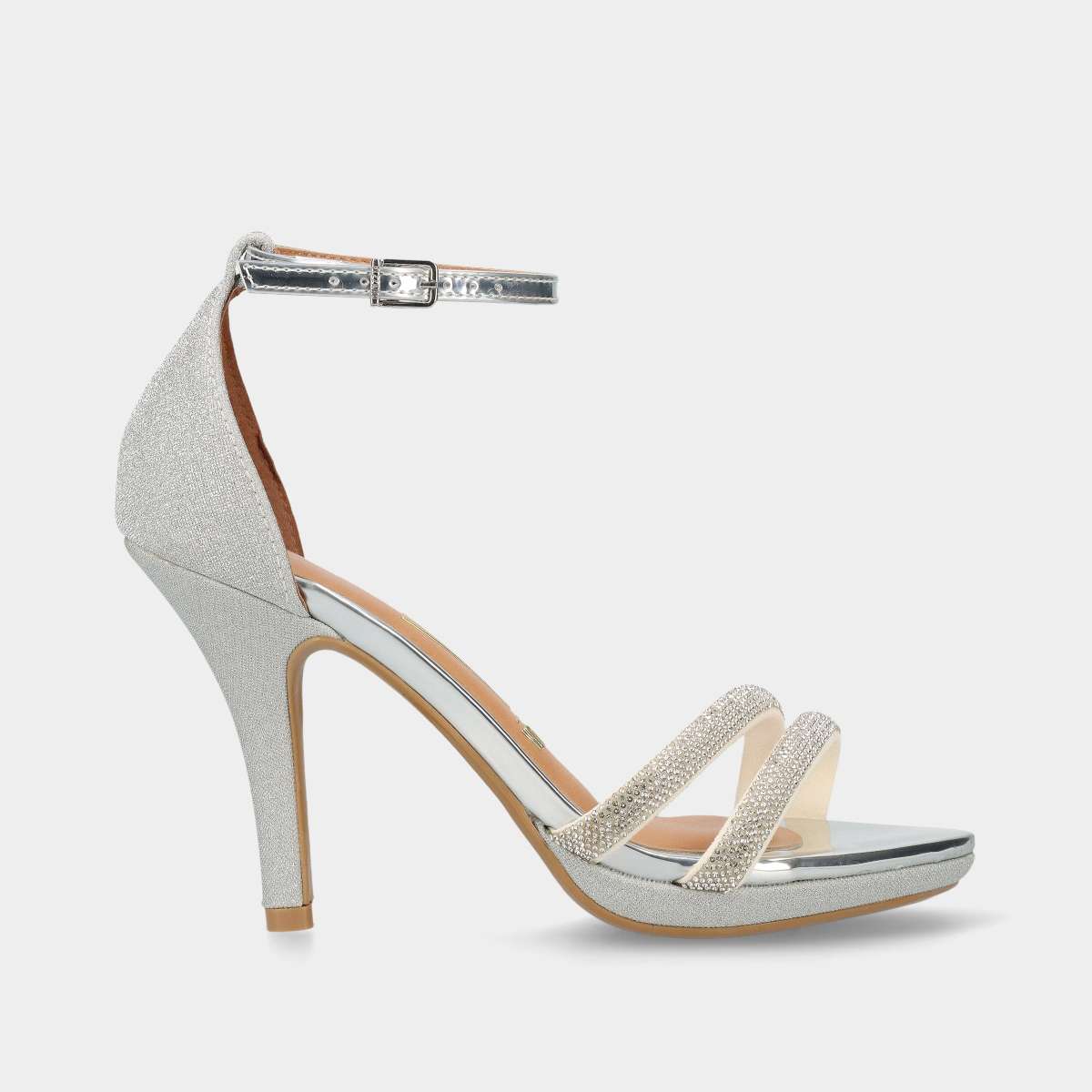 SANDÁLIA DE SALTO COM TIRA DE BRILHANTES E FIVELA