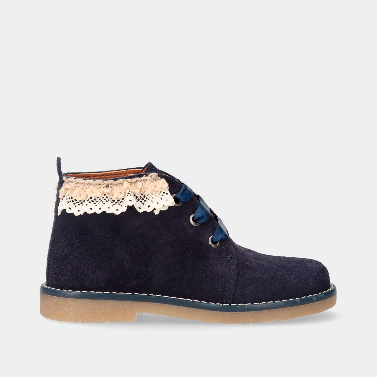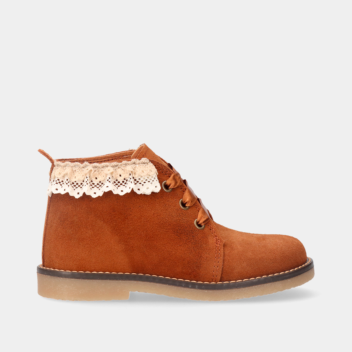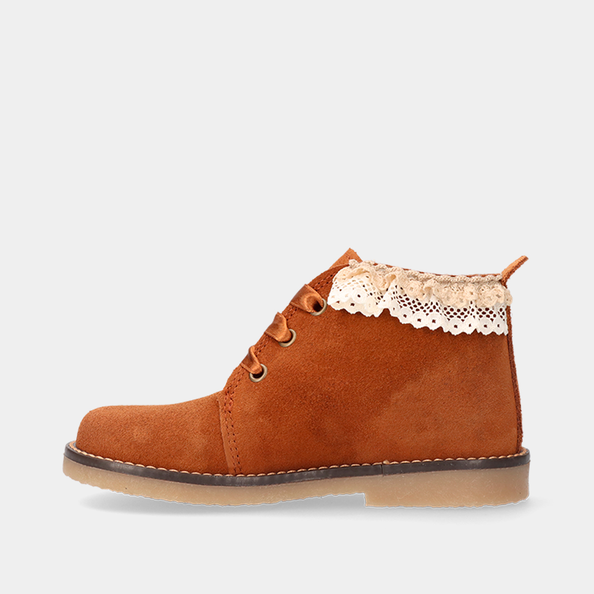 BOTIM EM PELE CAMURÇA DE CORDÃO COM PORMENORES EM RENDA US
