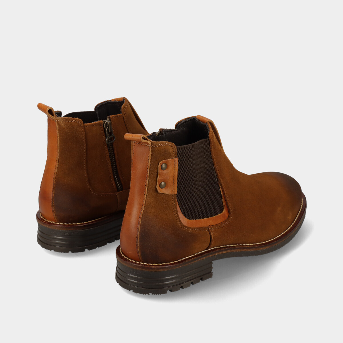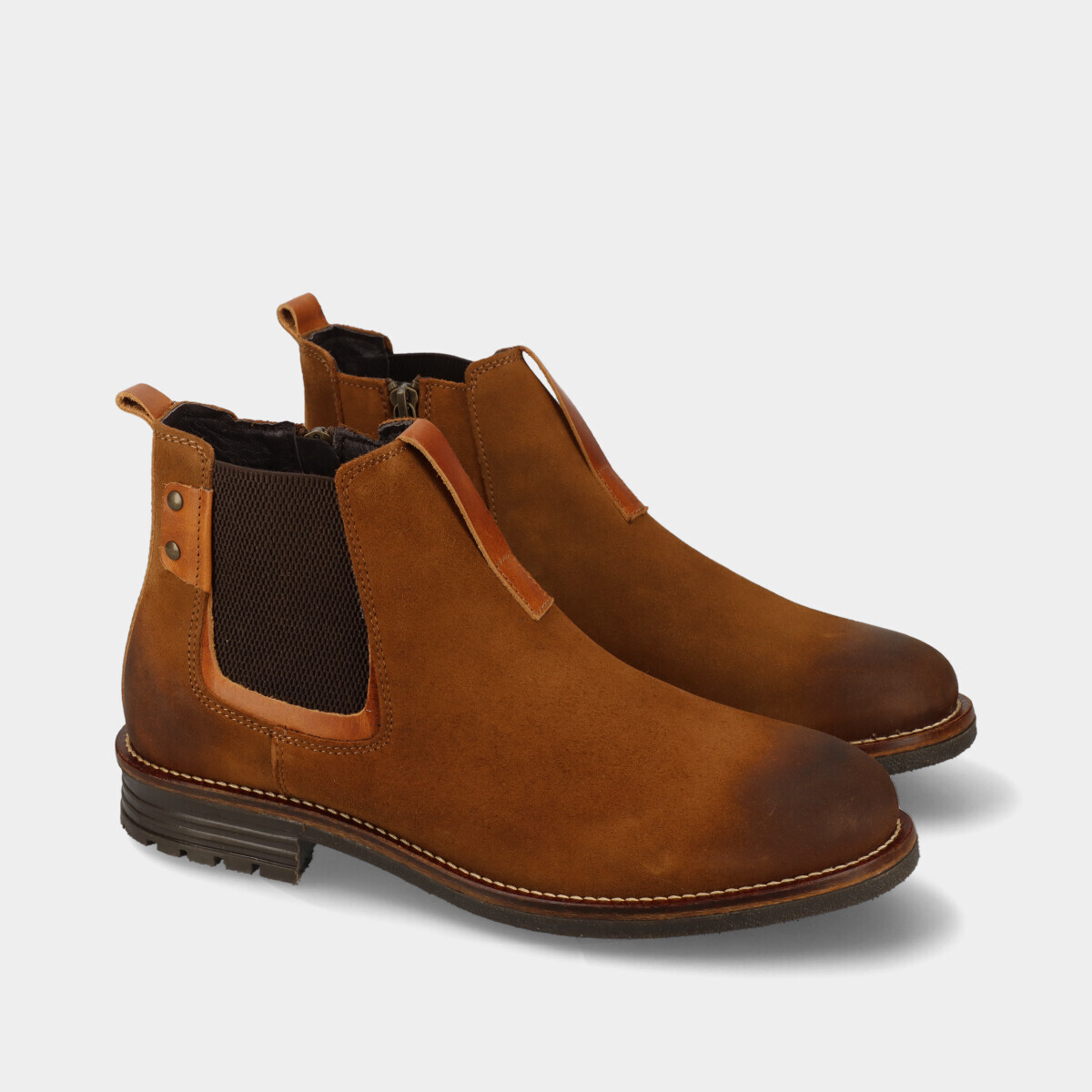 Botim Chelsea em pele camurça camel, com sola de borracha, palmilha removível, elástico e fecho nas laterais. Práticos e de qualidade nacional, ideais para o dia a dia.
