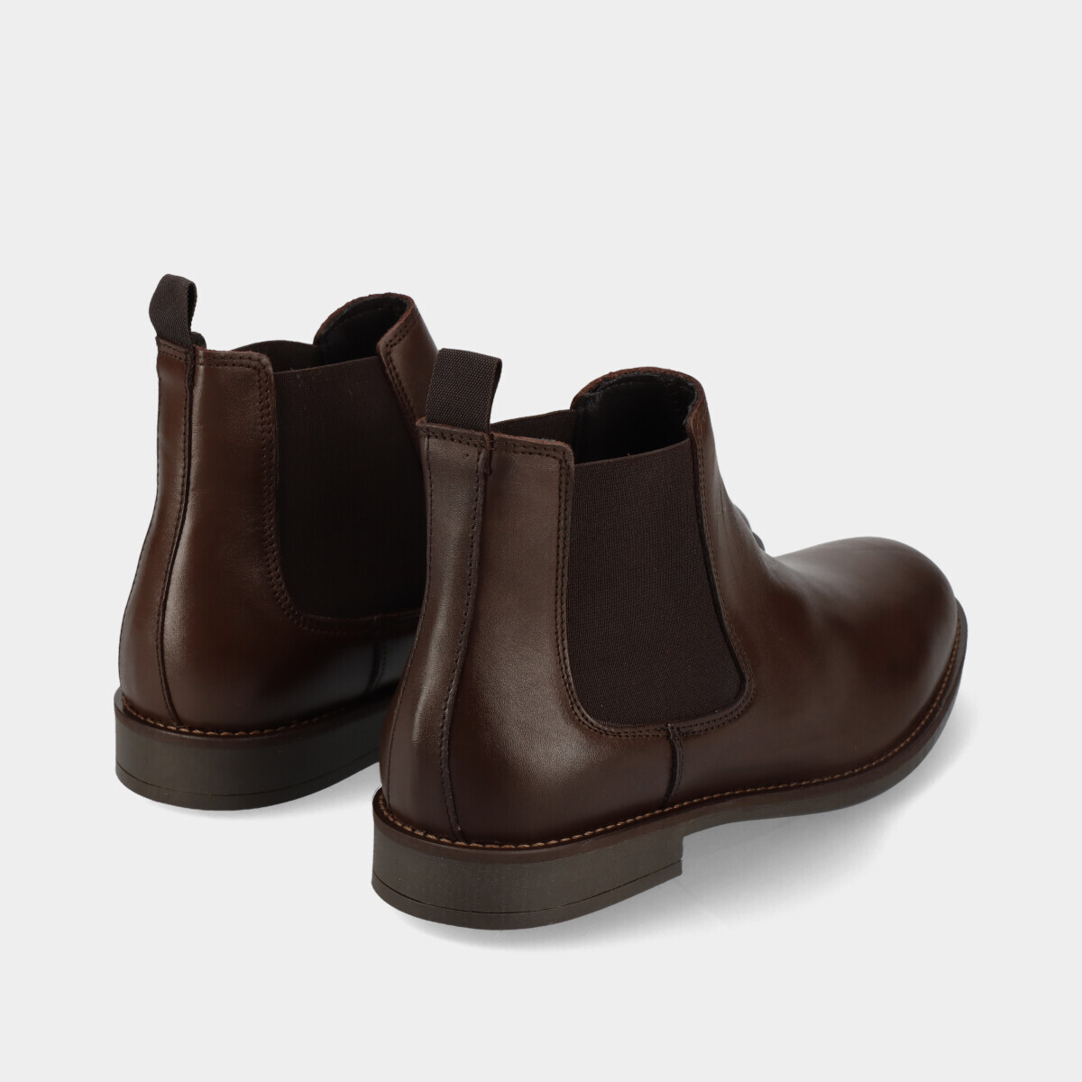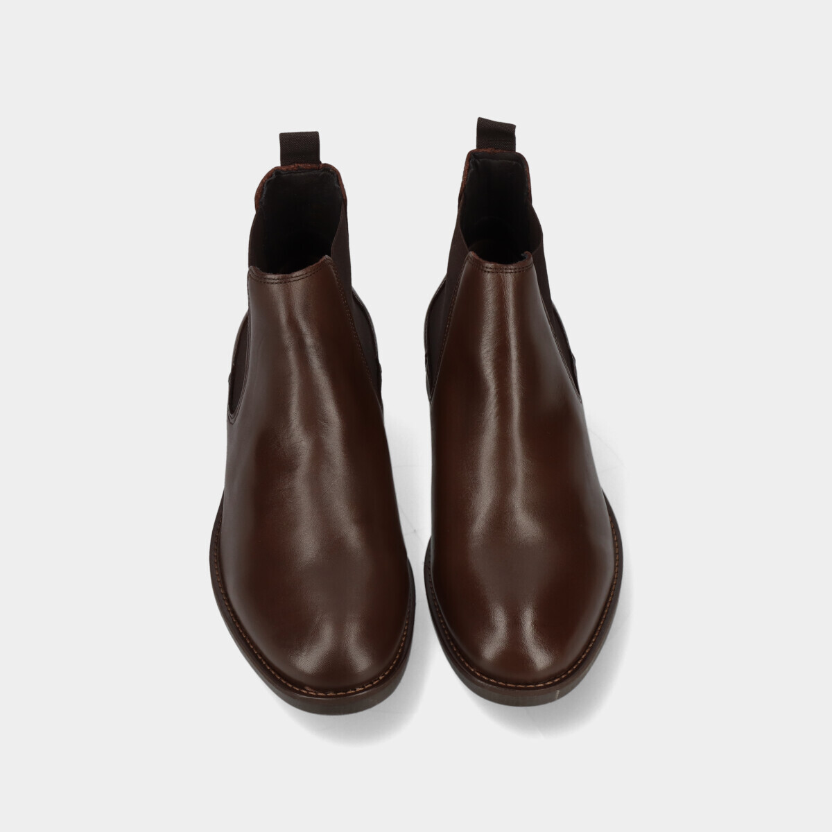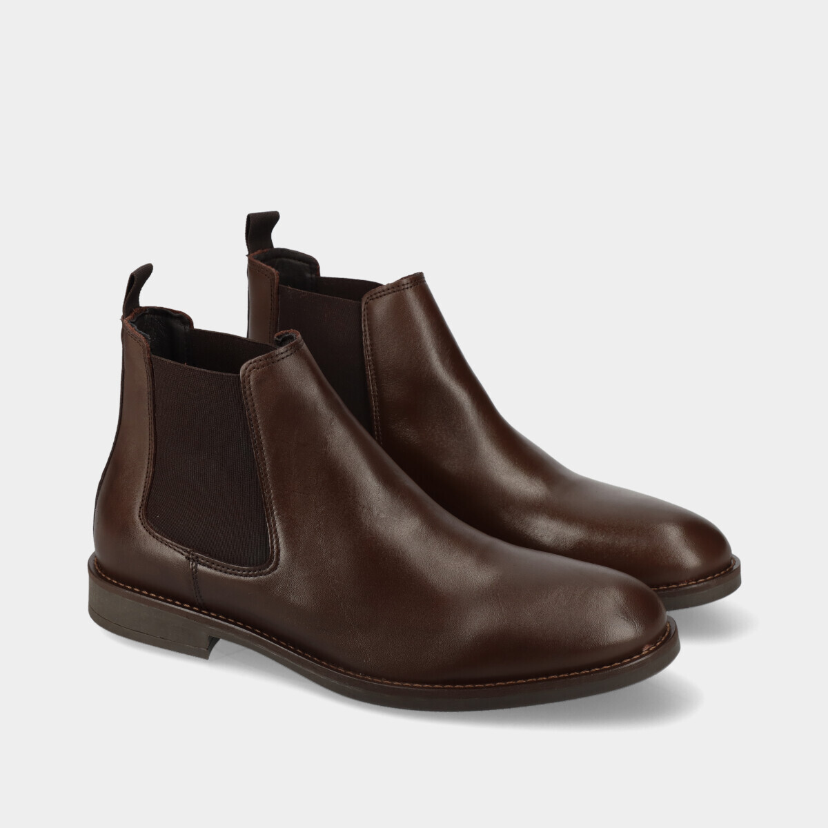 Botim Chelsea em pele castanha, com sola de borracha leve, palmilha removível e elásticos nas duas laterais. Práticos e de qualidade nacional, ideais para o dia a dia.