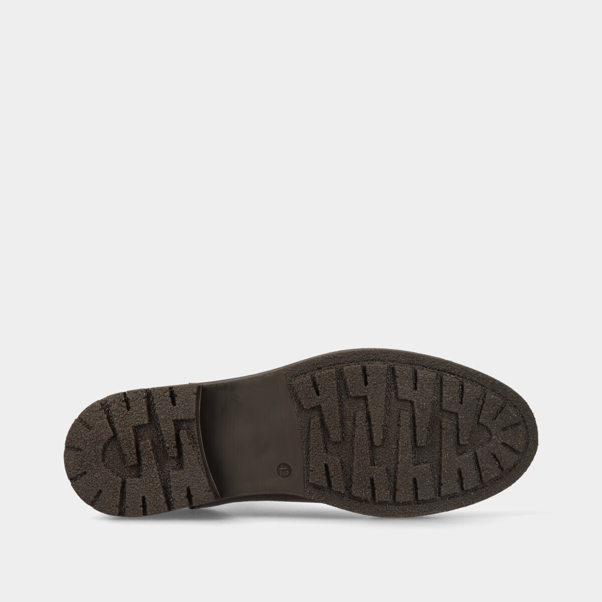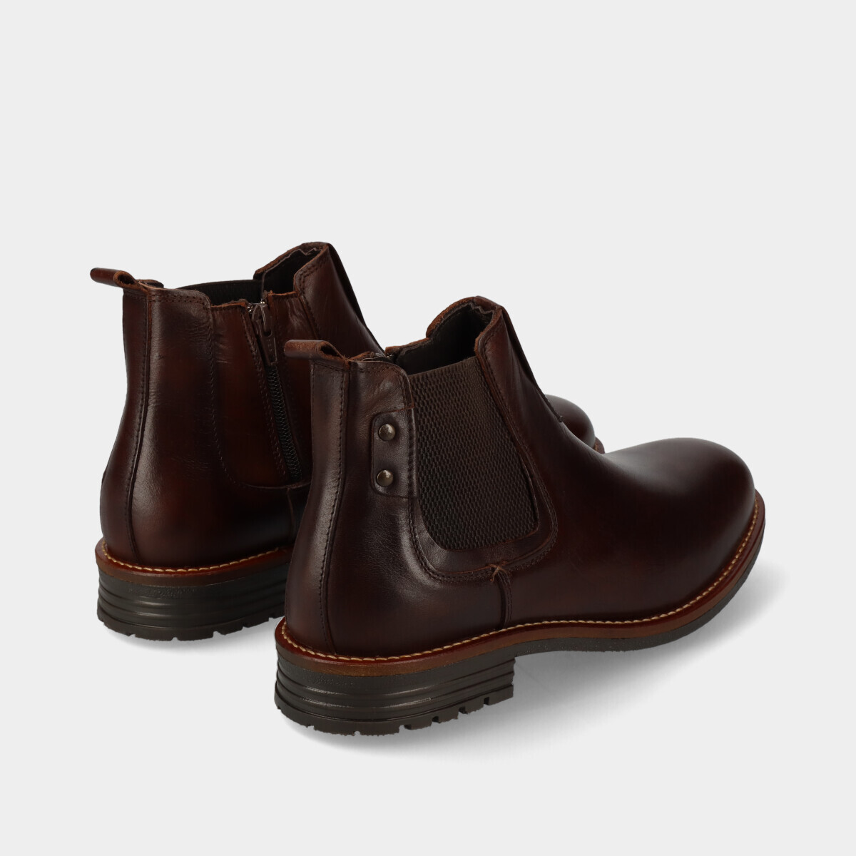 Botim Chelsea em pele castanha, com sola de borracha, palmilha removível, elástico e fecho nas laterais. Práticos e de qualidade nacional, ideais para o dia a dia.