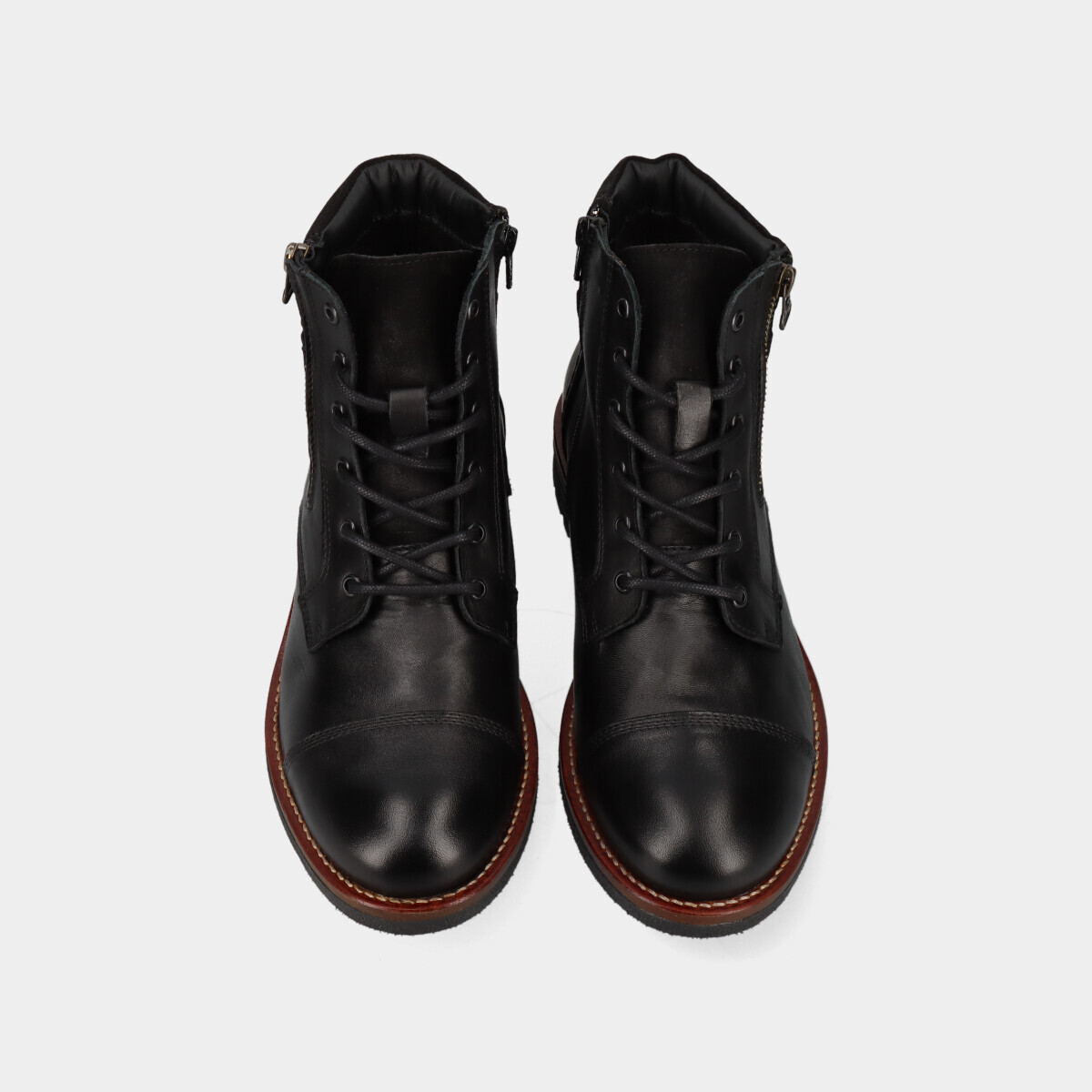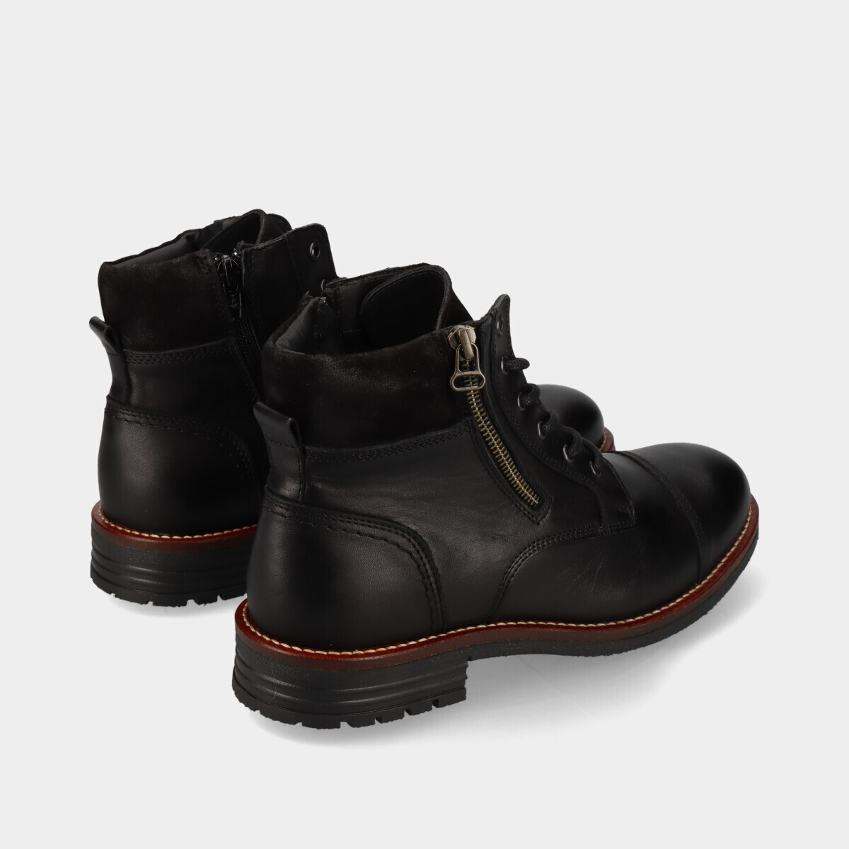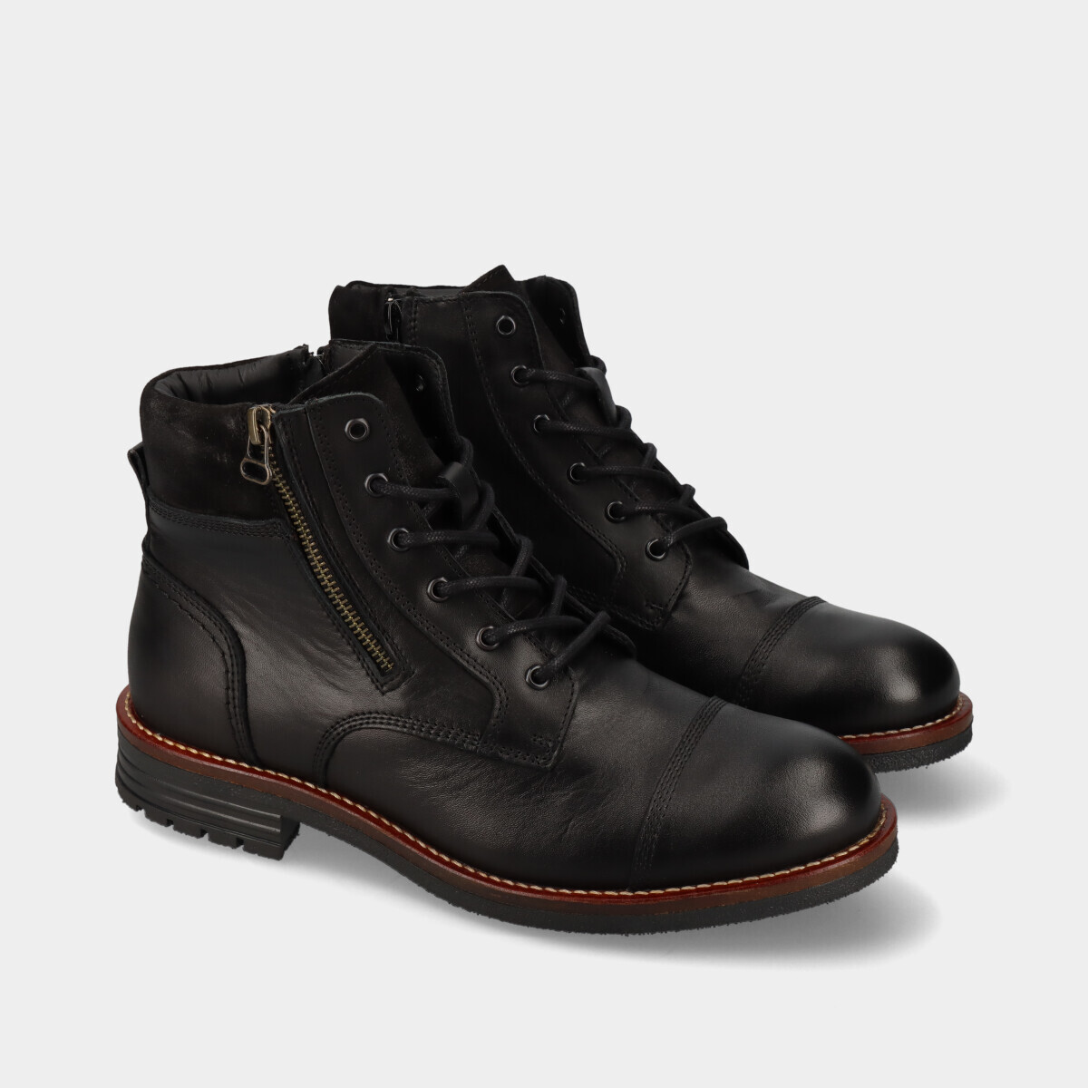 Botins em pele preta para homem, com palmilha confortável, sola de borracha robusta, atacadores e fecho. Práticos e de qualidade nacional, ideais para o dia a dia.