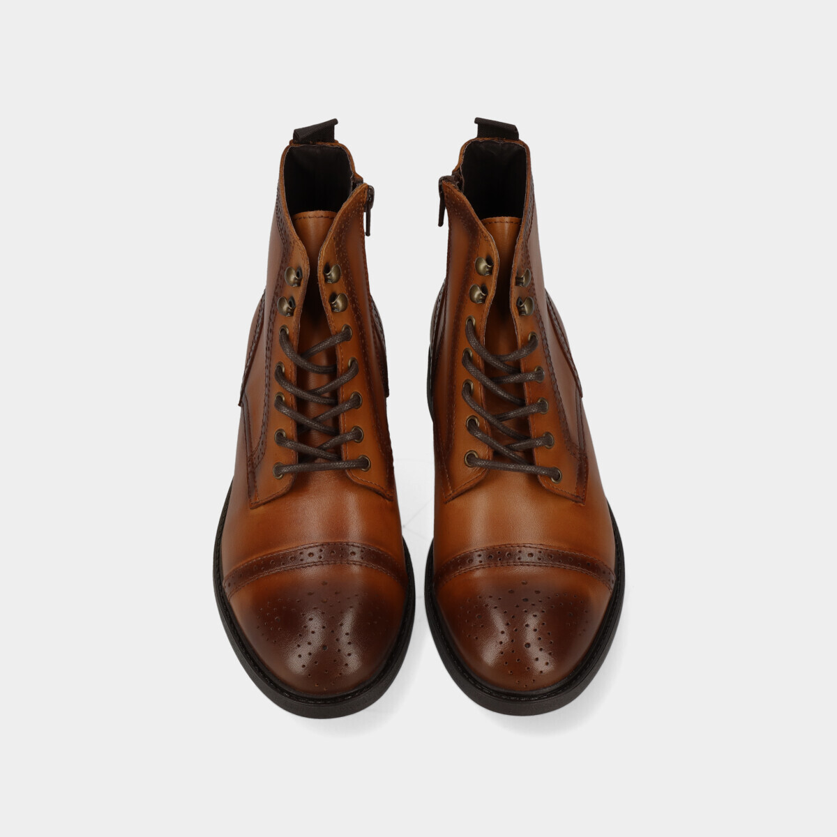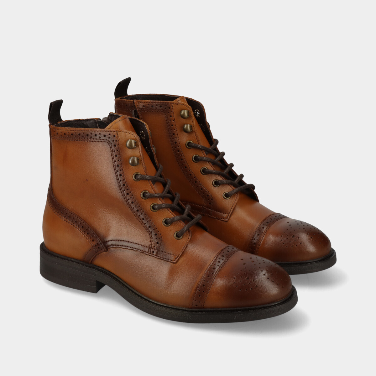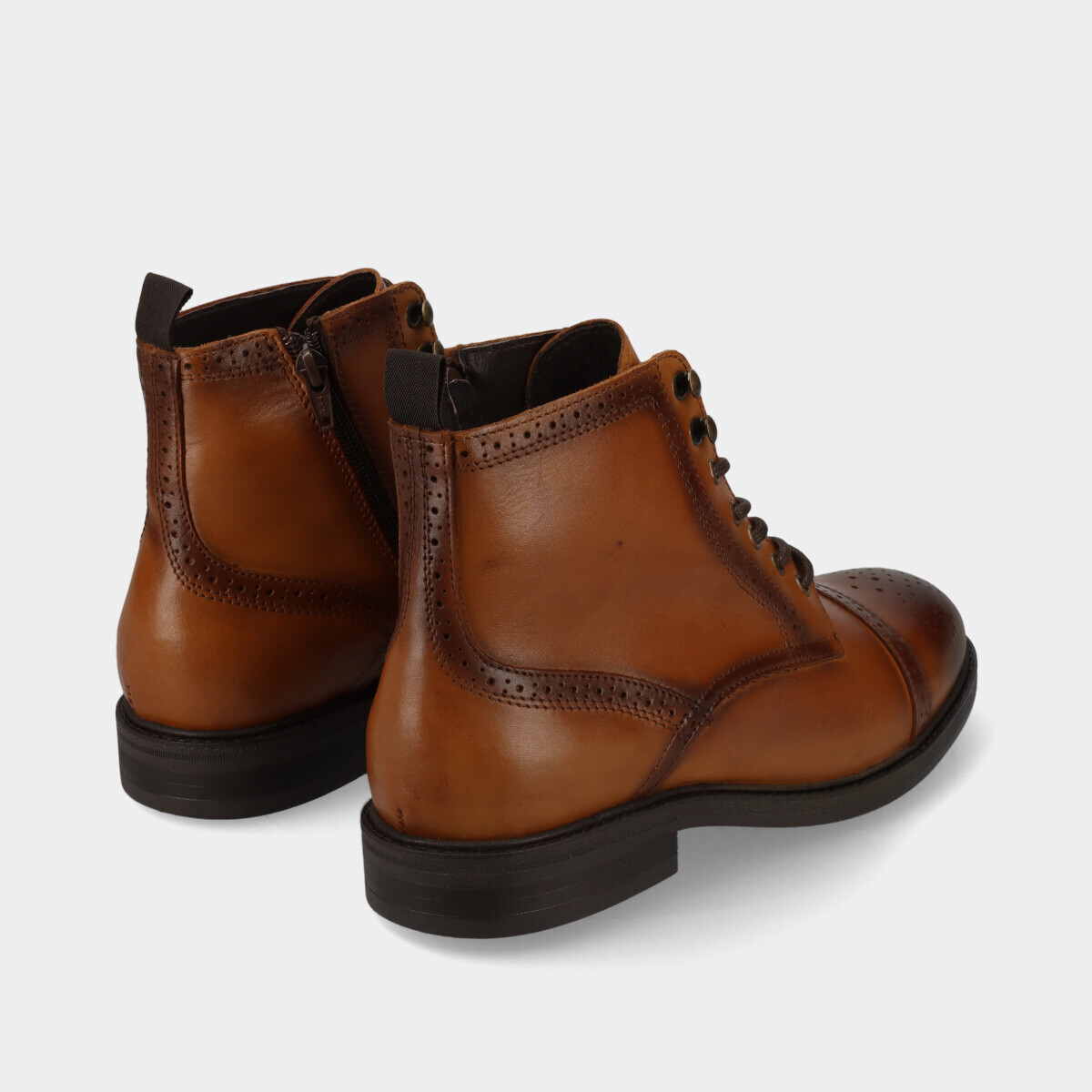 Botim de homem em pele conhaque, com detalhes elegantes e biqueira redonda. Sola robusta de borracha, forro macio e palmilha acolchoada garantem conforto ao longo do dia, com design moderno. Fabricado em Portugal.