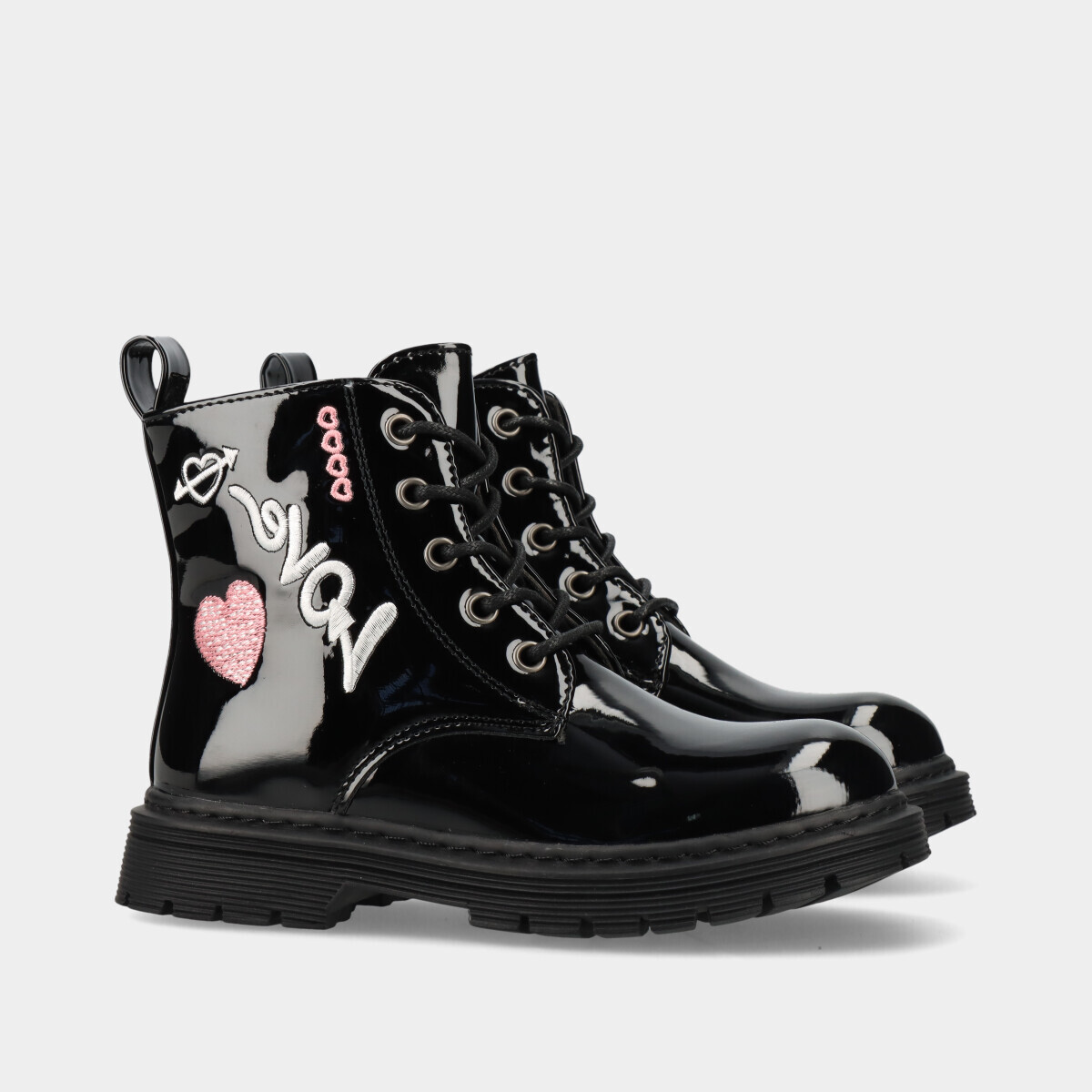 Botas para menina em preto com efeito verniz, atacador e fecho lateral que facilitam o calçar, leves e práticas para o dia a dia. Oferta de atacador multicolorido extra.