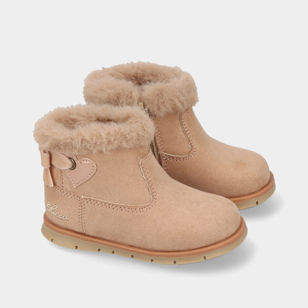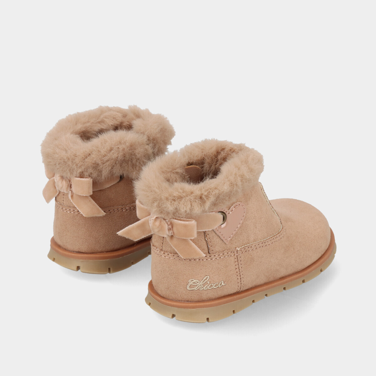 Botim para menina em rosa com gola de pelo, laço na parte de trás e fecho lateral. Leves e confortáveis, ideais para a escola e fáceis de calçar no dia a dia.