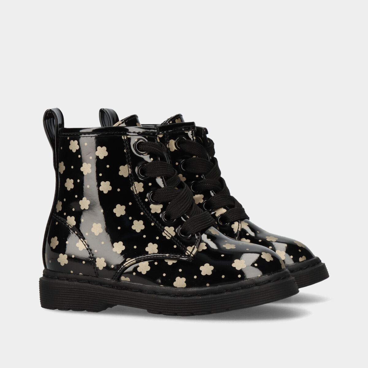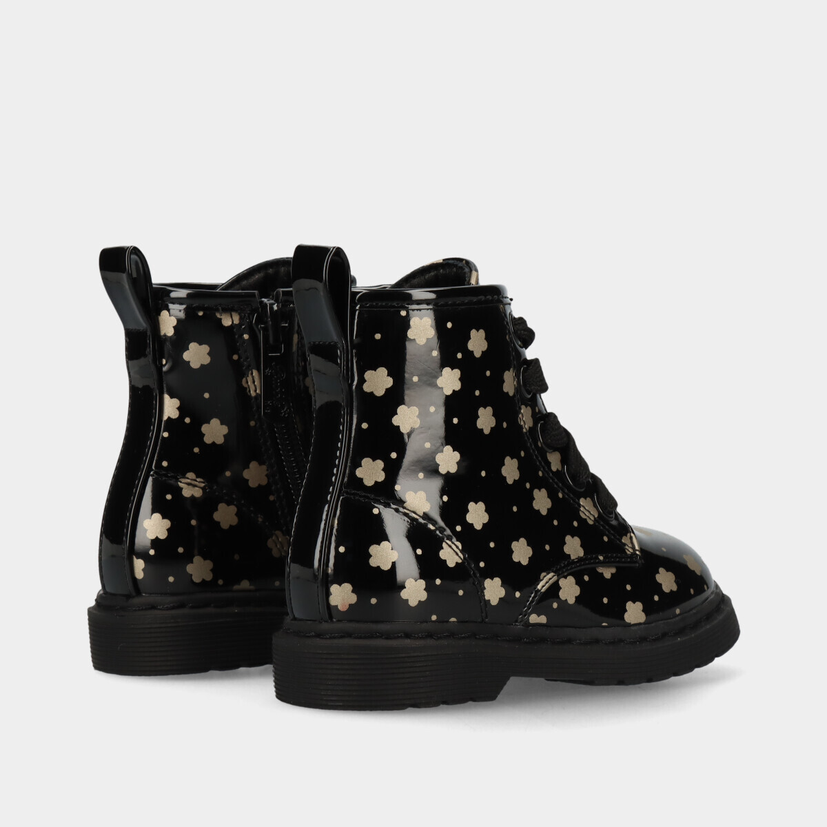 Botas para menina em preto com efeito verniz e padrão dourado, atacador e fecho lateral que facilitam o calçar, leves e práticas para o dia a dia.