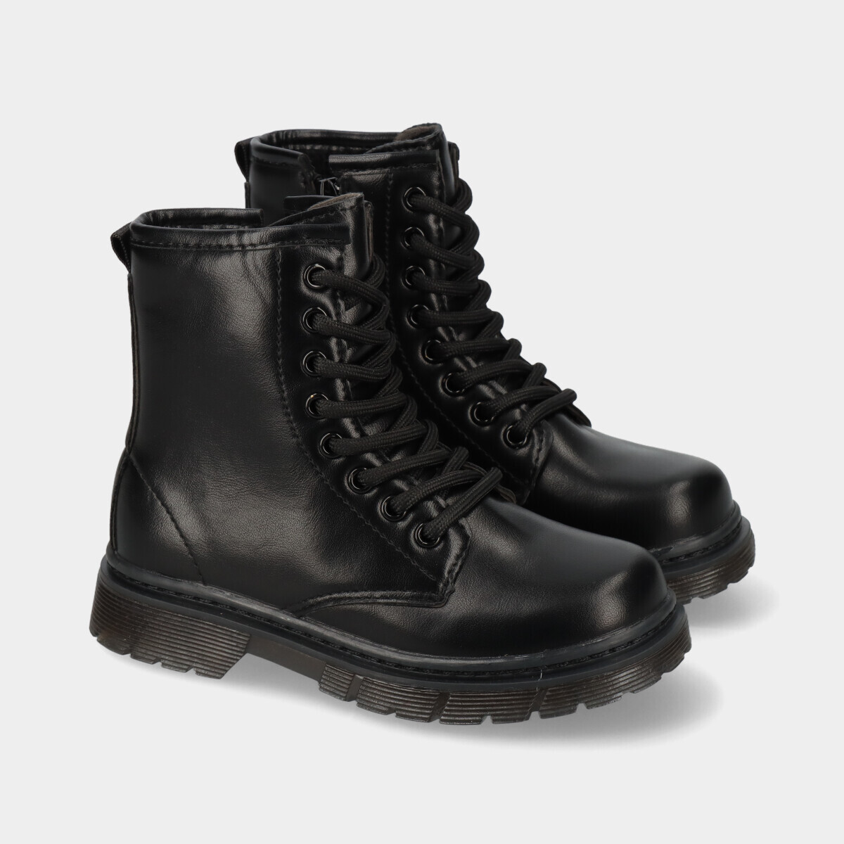 Botas para menina em preto com efeito pele, atacador e fecho lateral que facilitam o calçar, leves e práticas para o dia a dia.