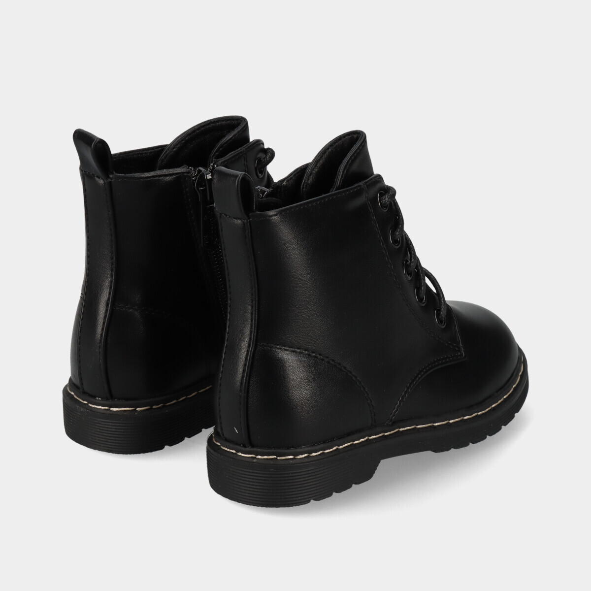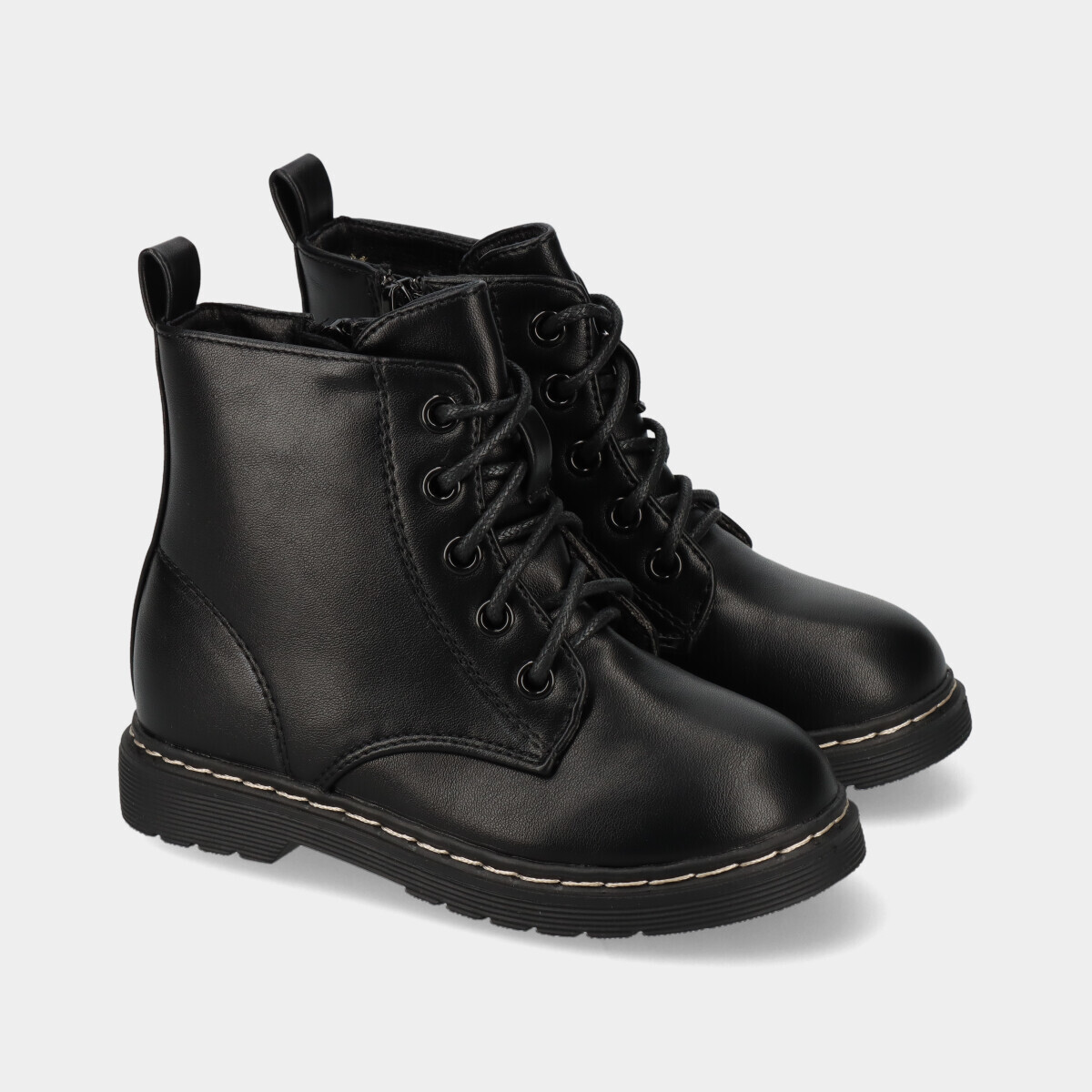 Bota estilo militar para menina com efeito pele, forro confortável e fecho lateral interior que facilita o calçar. Calçado infantil prático, ideal para o dia a dia.