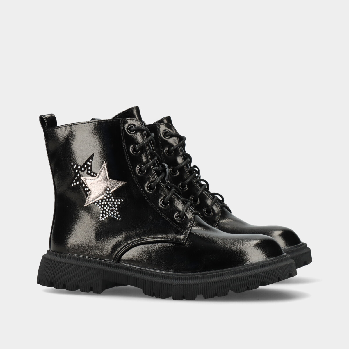 Botas para menina em preto com efeito pele, atacador e fecho lateral que facilitam o calçar, leves e práticas para o dia a dia.