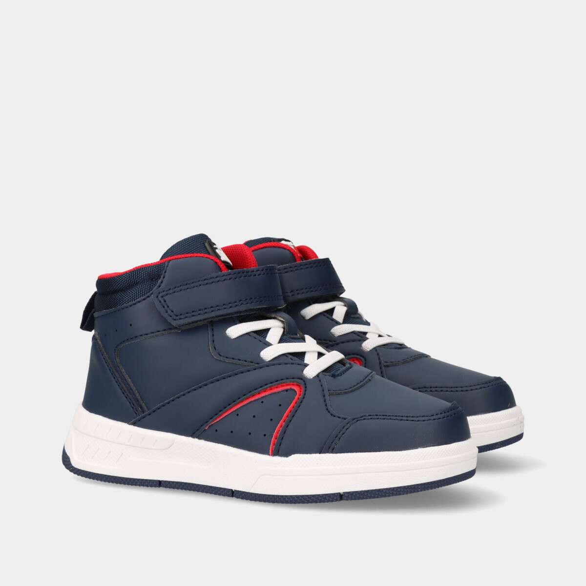 Bota desportiva na cor azul com velcro e cordão elástico.
