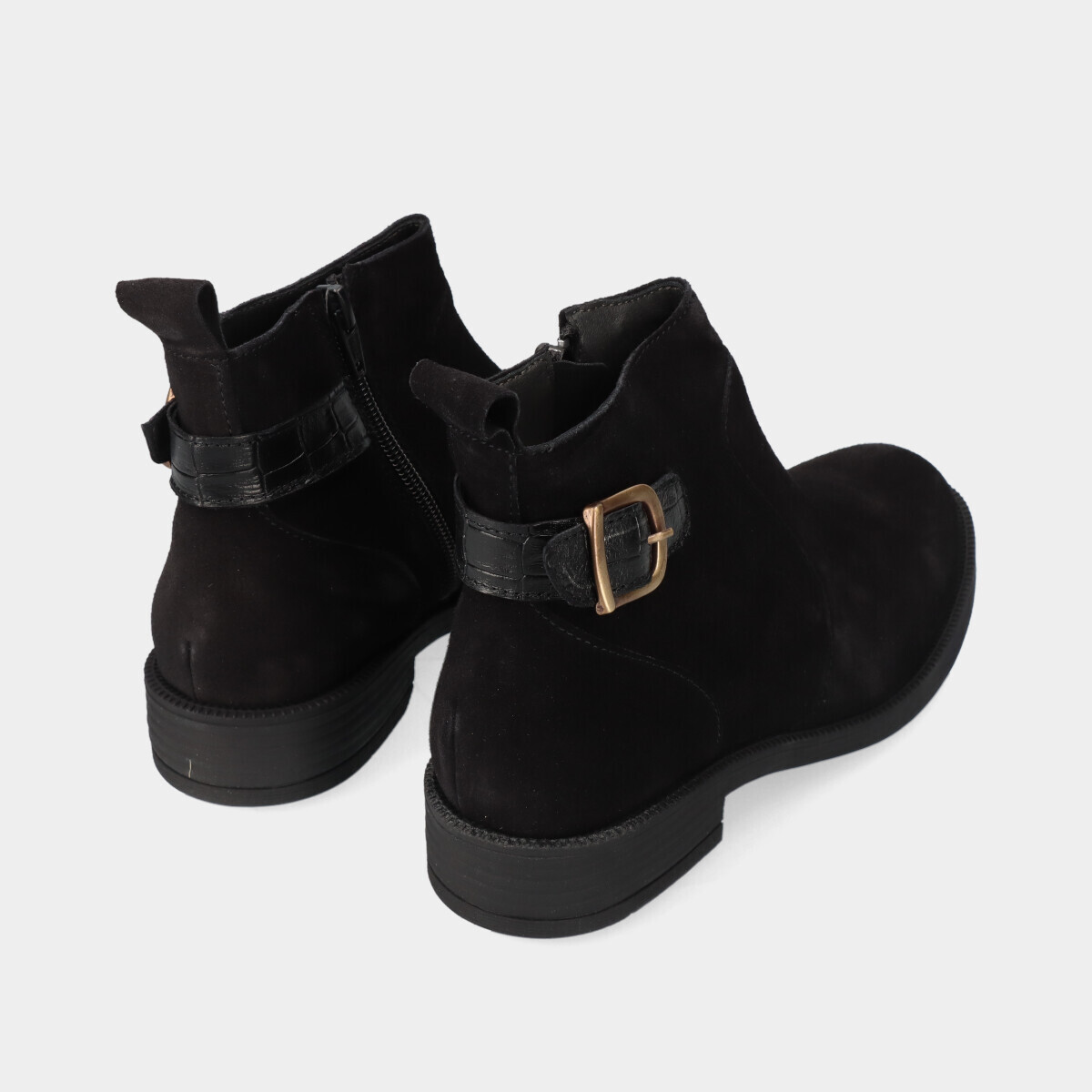 As botas em camurça com fecho e uma fivela como aplicação, na cor preta, são uma expressão de estilo e conforto para a mulher que valoriza a elegância casual.