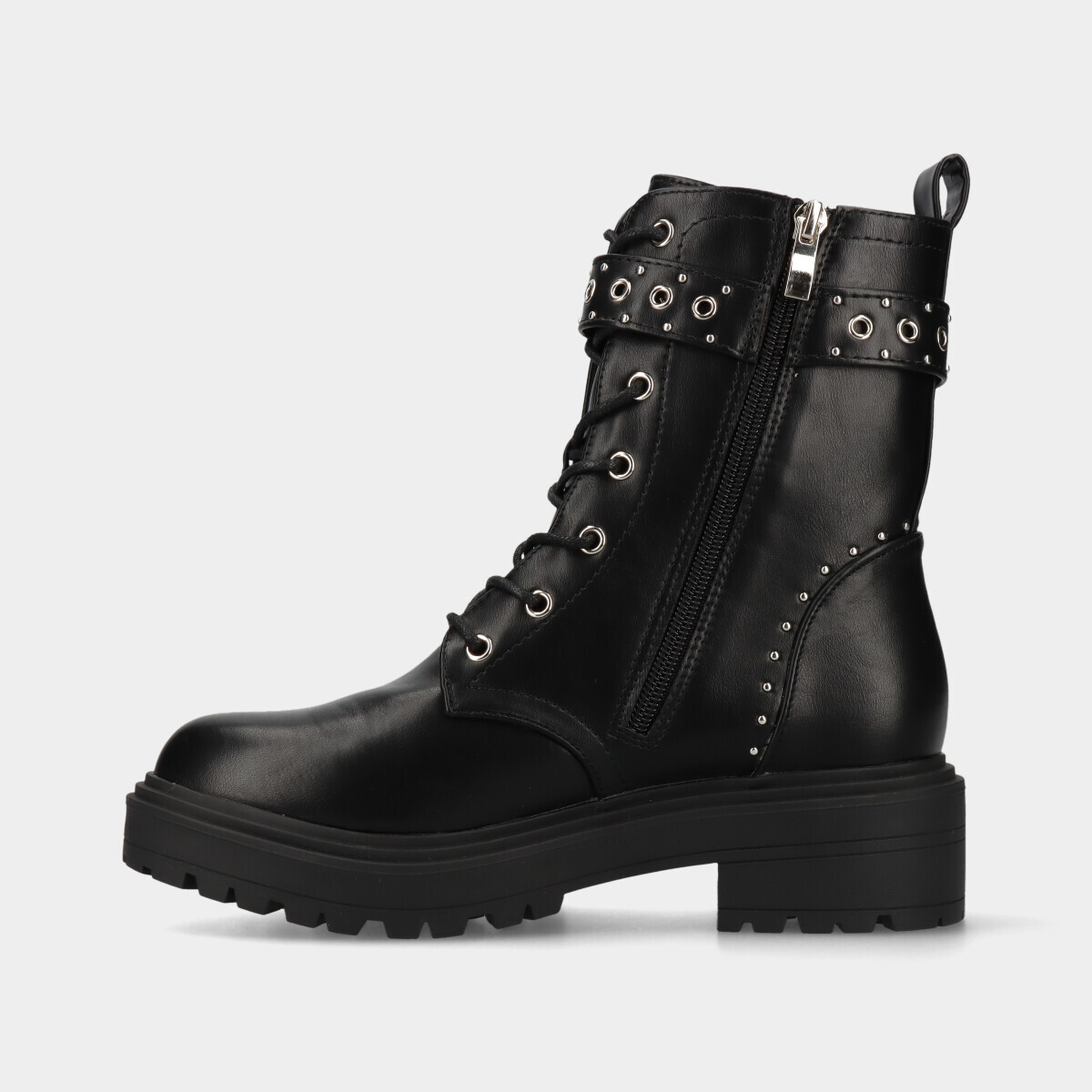 Bota para mulher com efeito pele, tachas decorativas, fivelas, cordão e fecho, forro confortável e design moderno.