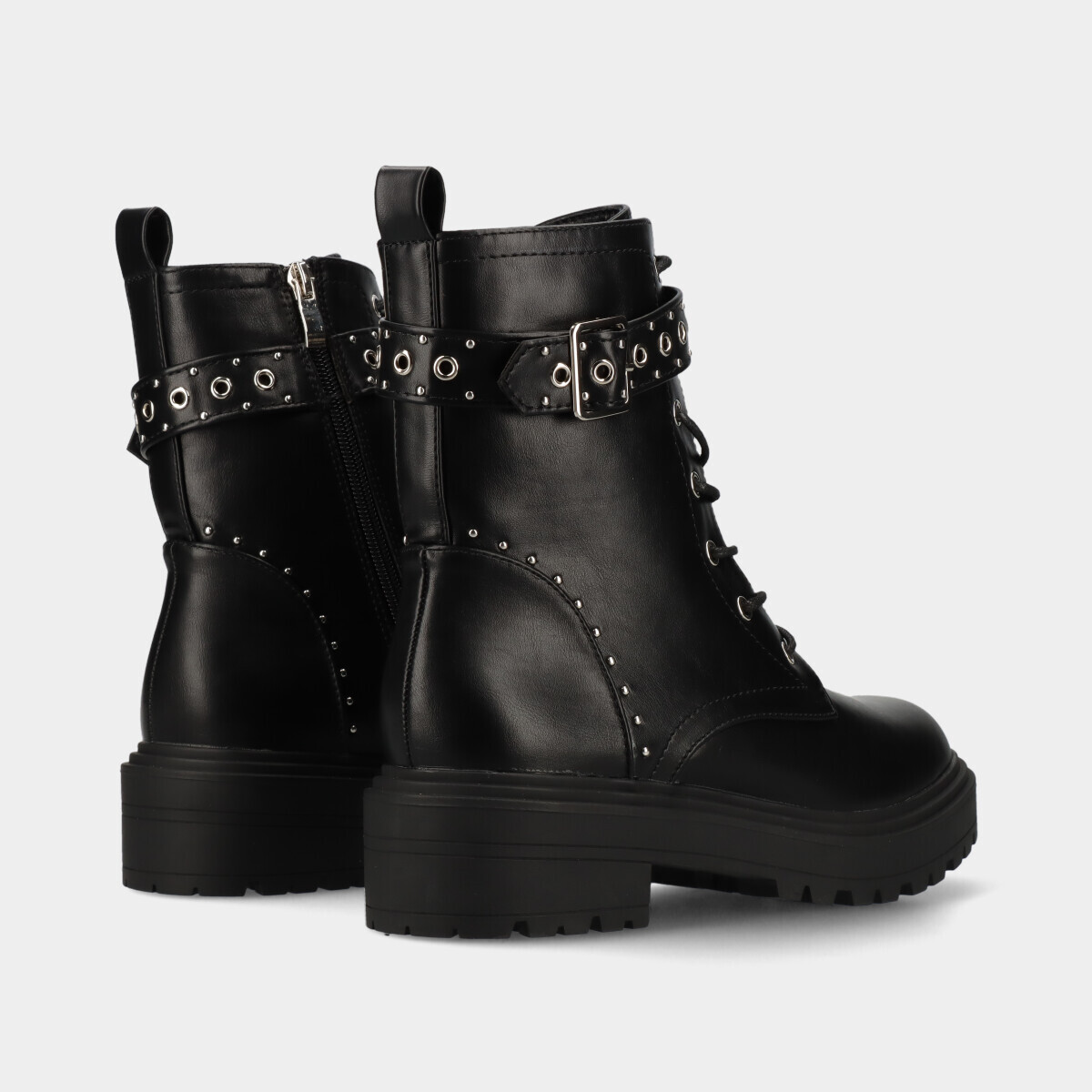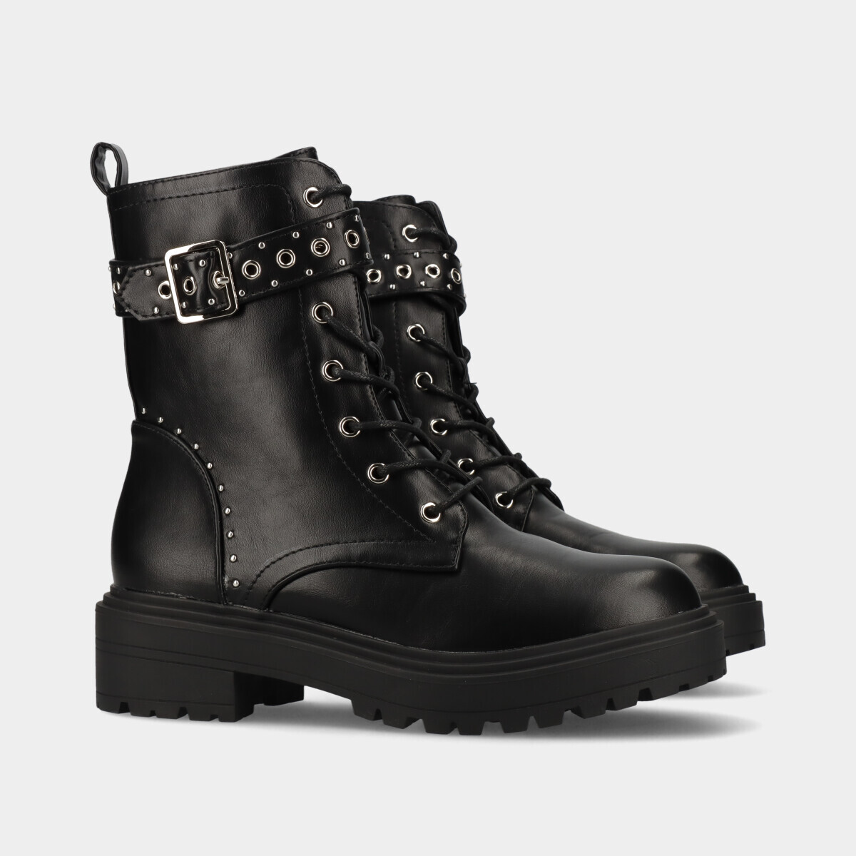 Botas para mulher em preto com sola grossa tratorada, atacadores, fivela e fecho lateral. Design moderno, ideais para o dia a dia e para complementar looks casuais.