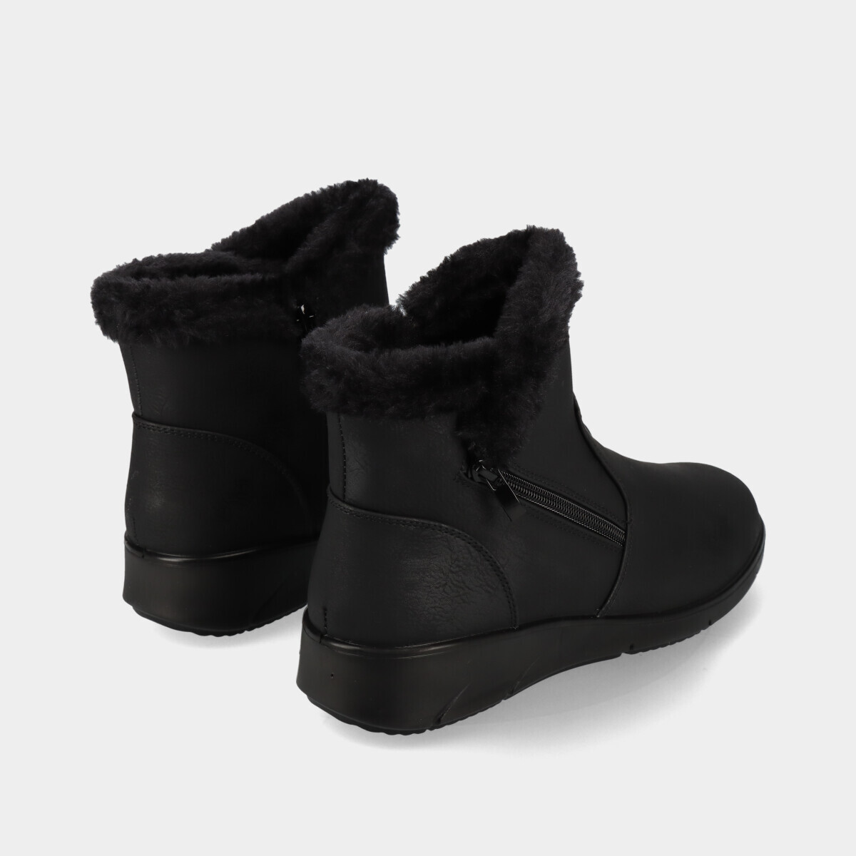 Botins de conforto para mulher em preto, com pequena cunha, forro macio, gola de pelo e fecho nas laterais, ideais para uso diário.
