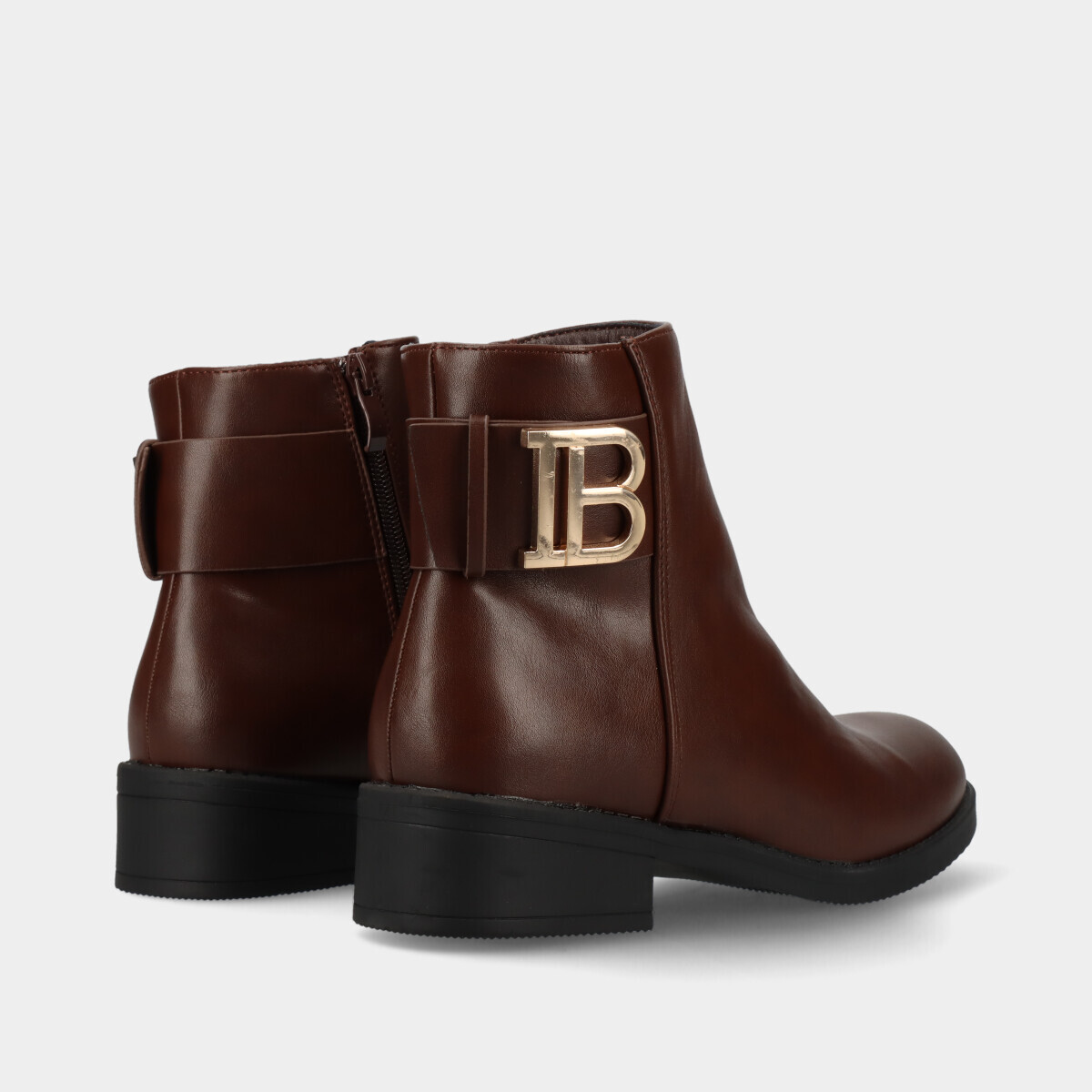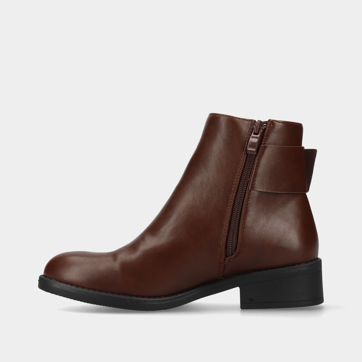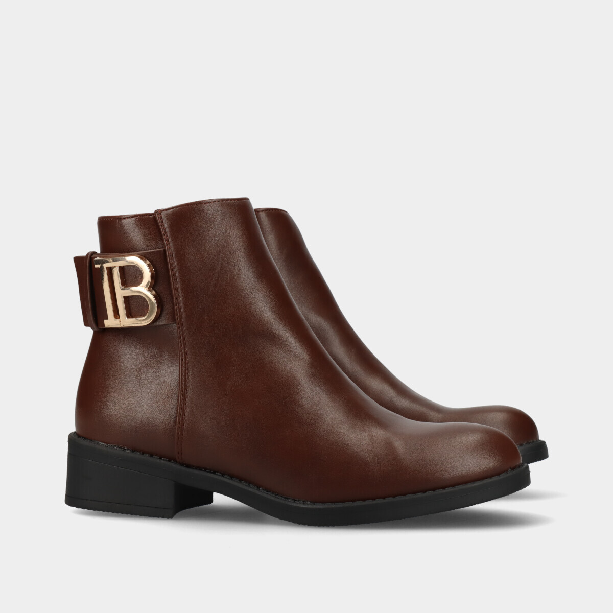Botim para mulher em castanho, com aplicação dourada e fecho prático na lateral.