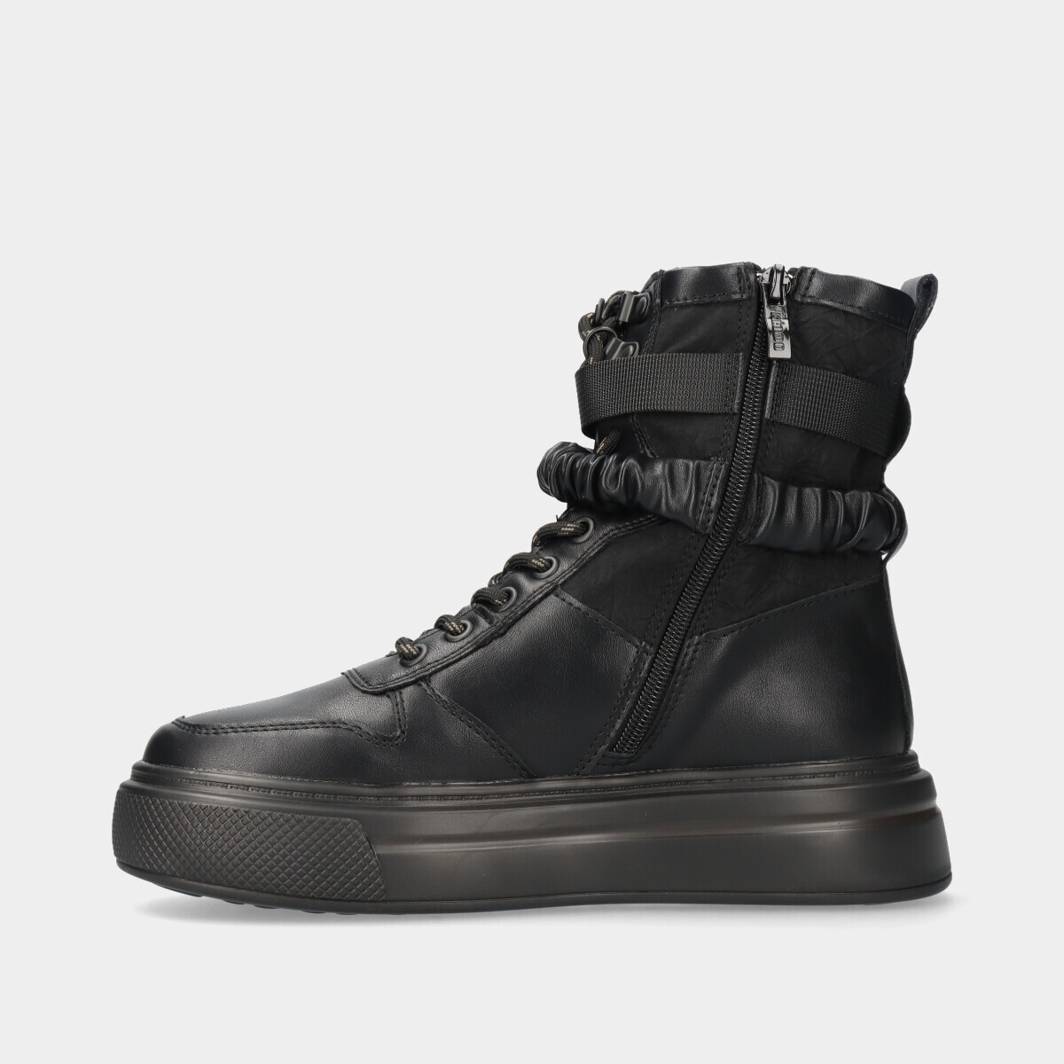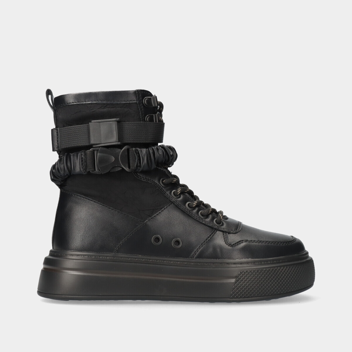 Bota de cano médio-alto com sola de plataforma robusta, cordão e fecho lateral.