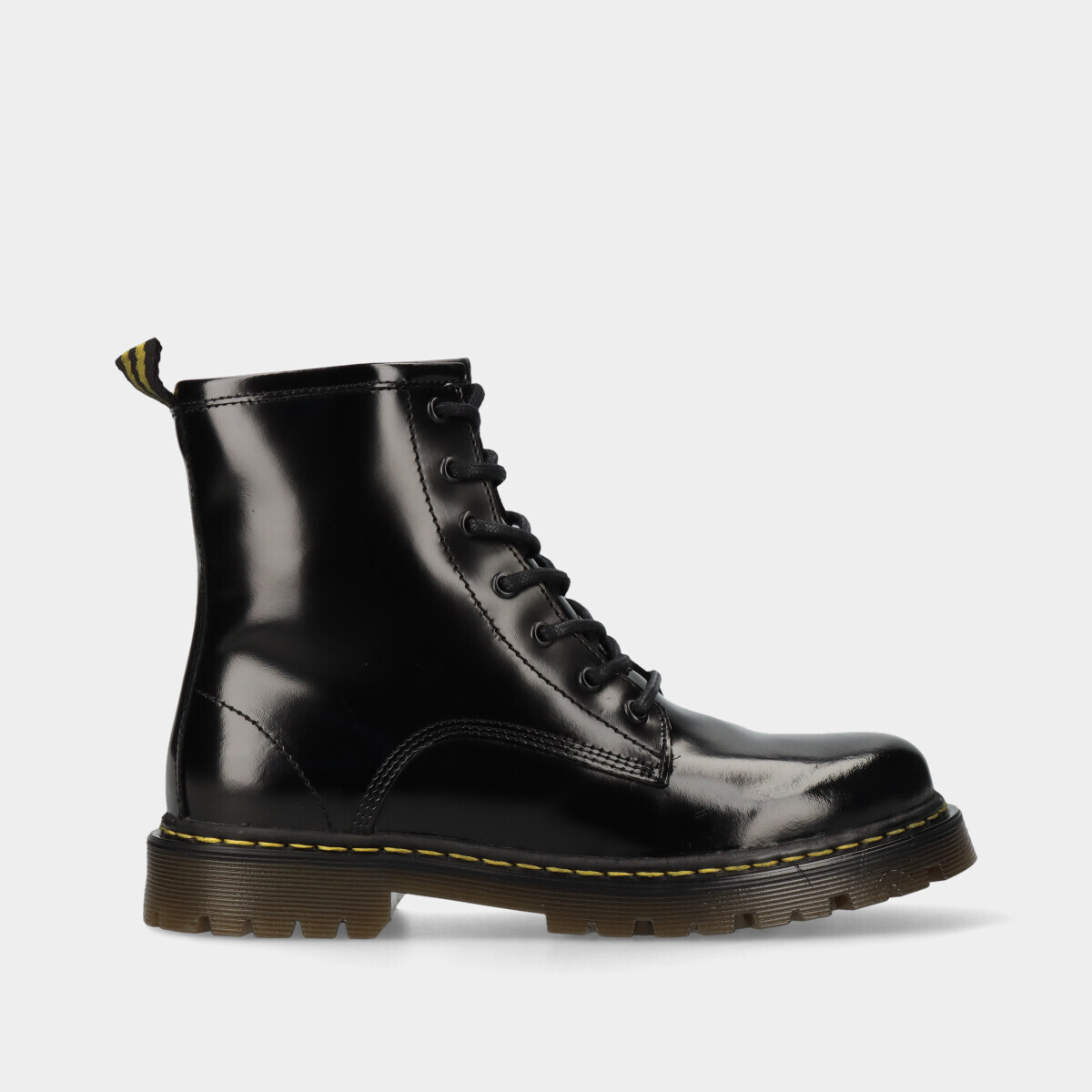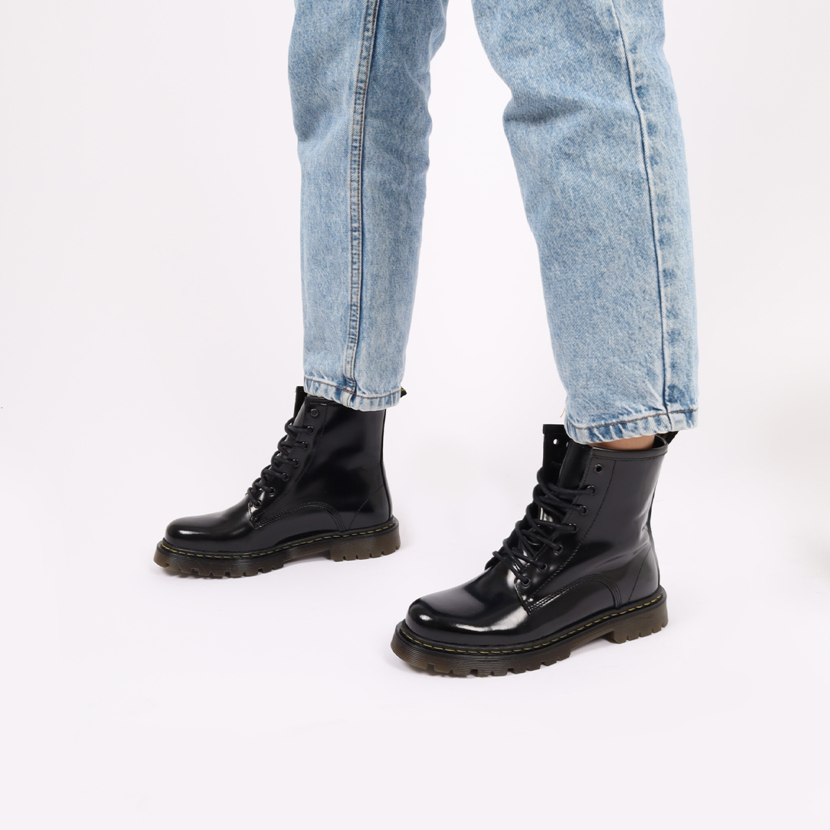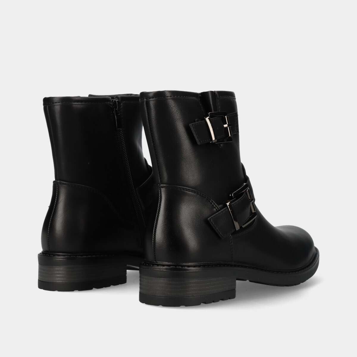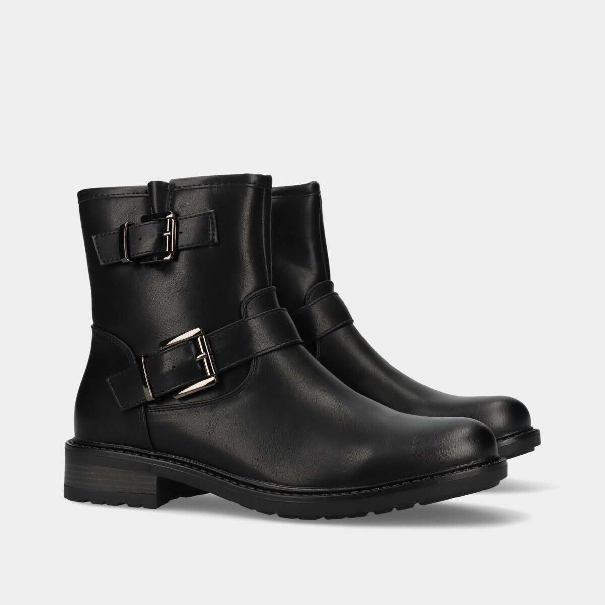 Bota na cor preta com fivelas decorativas e fecho lateral.