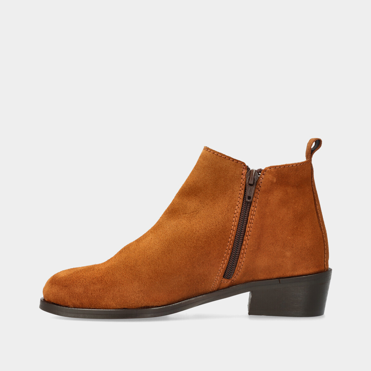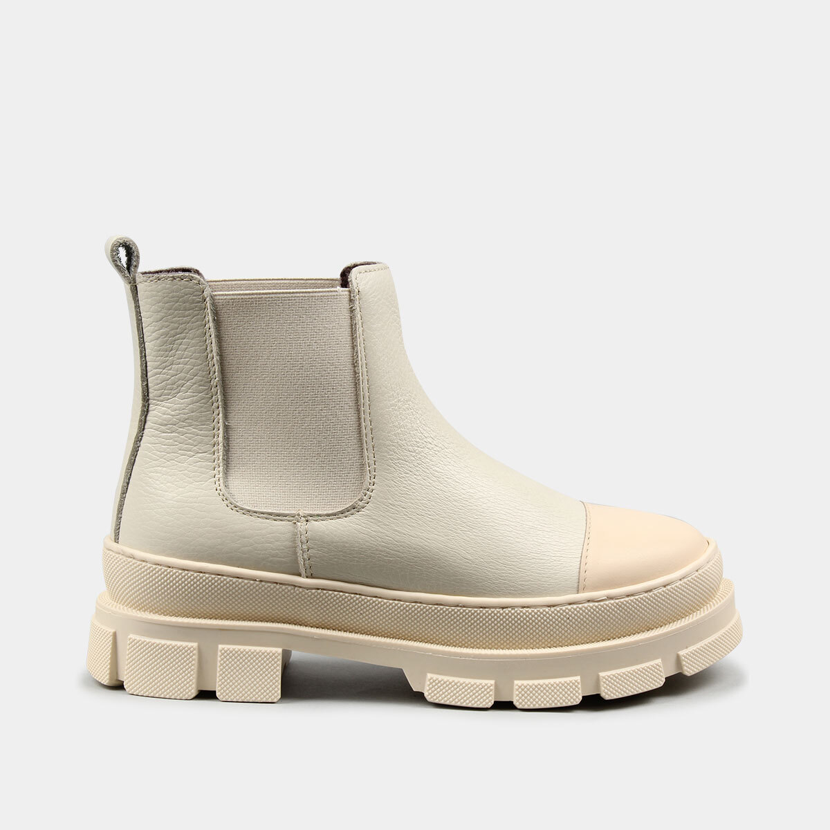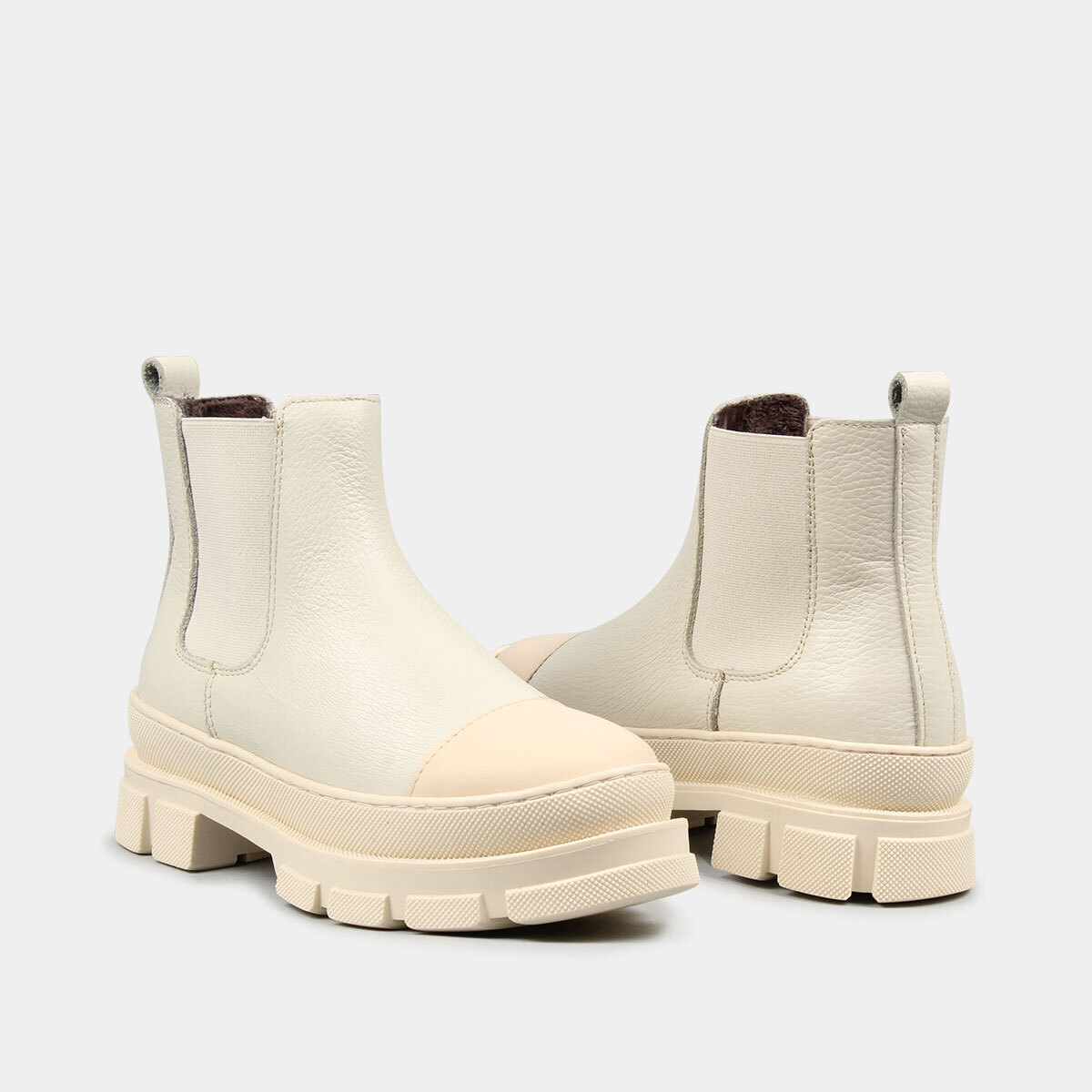 Bota na cor camel com cordão, fecho e elástico na parte de trás.