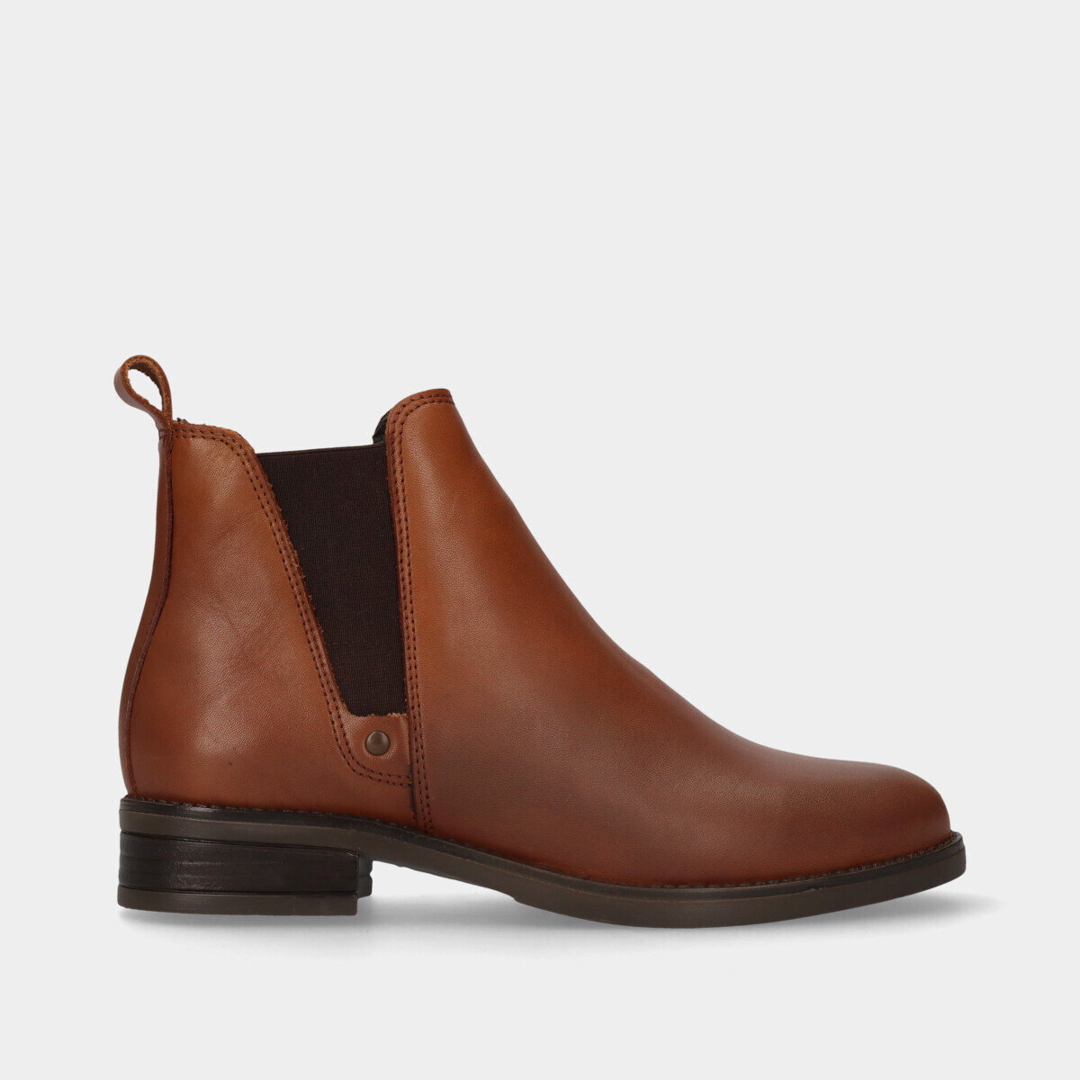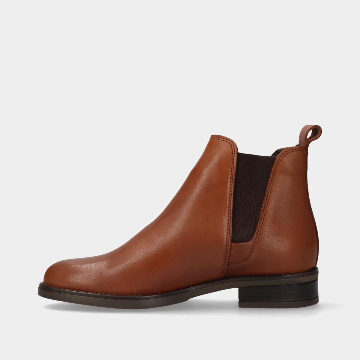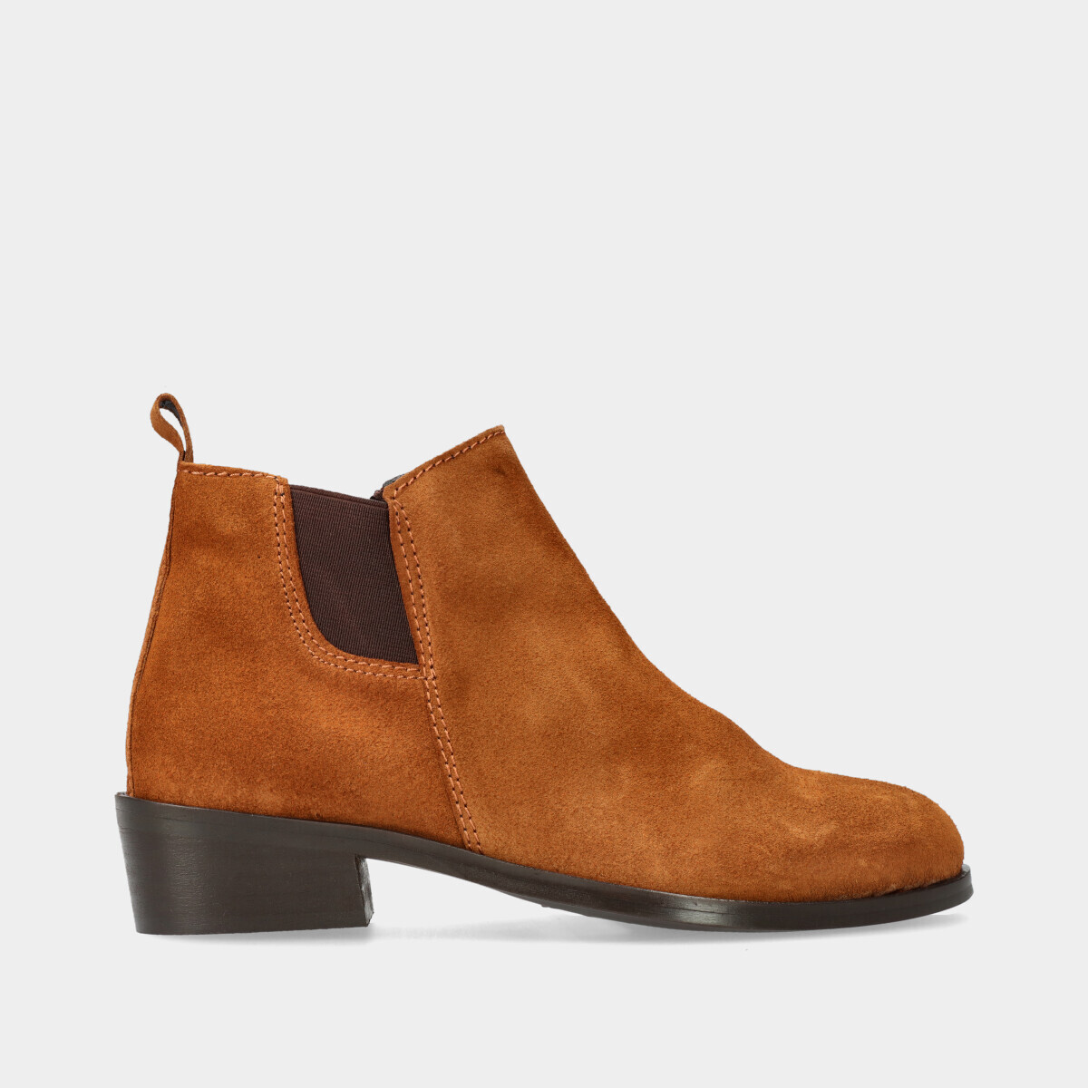 Bota na cor camel com cordão, fecho e elástico na parte de trás.
