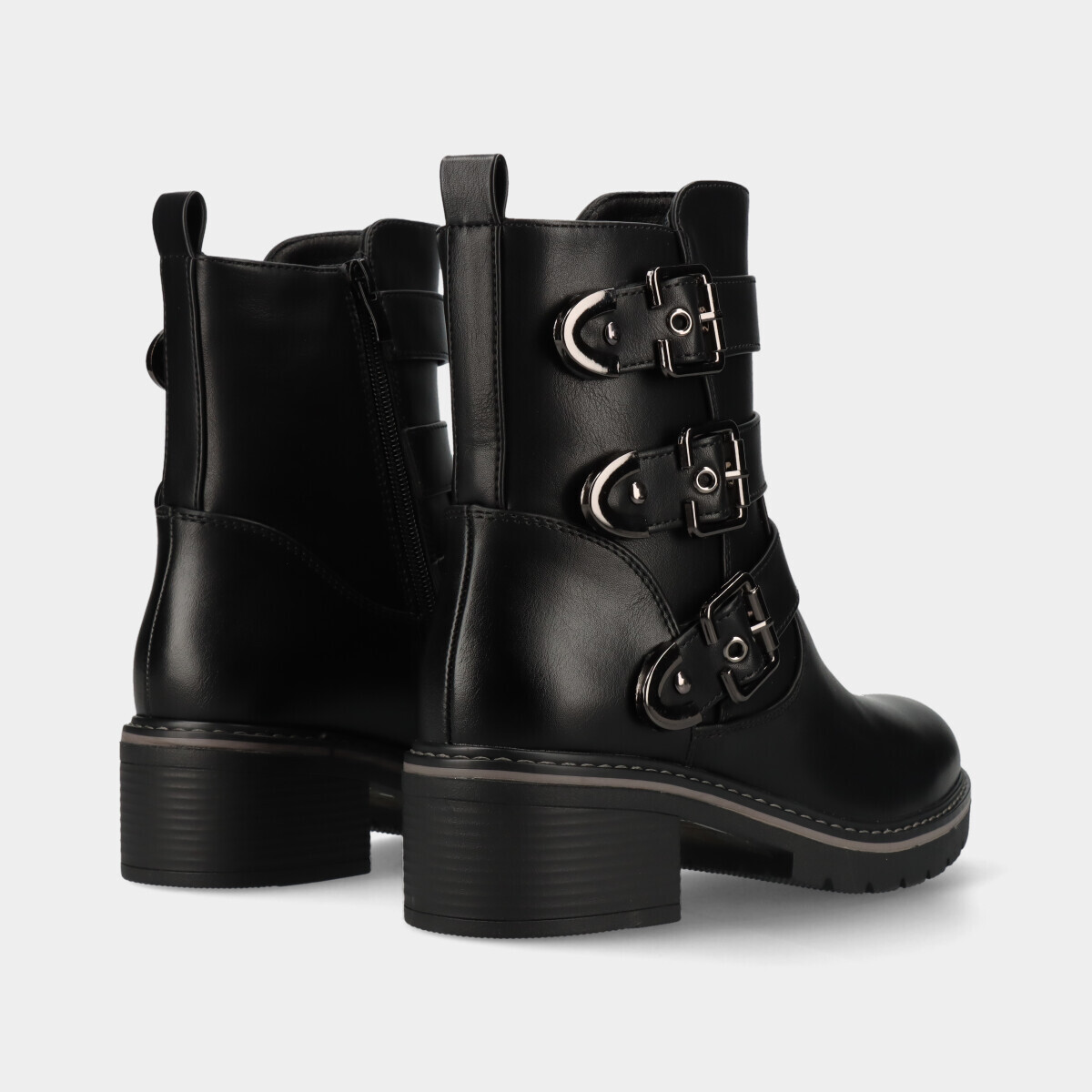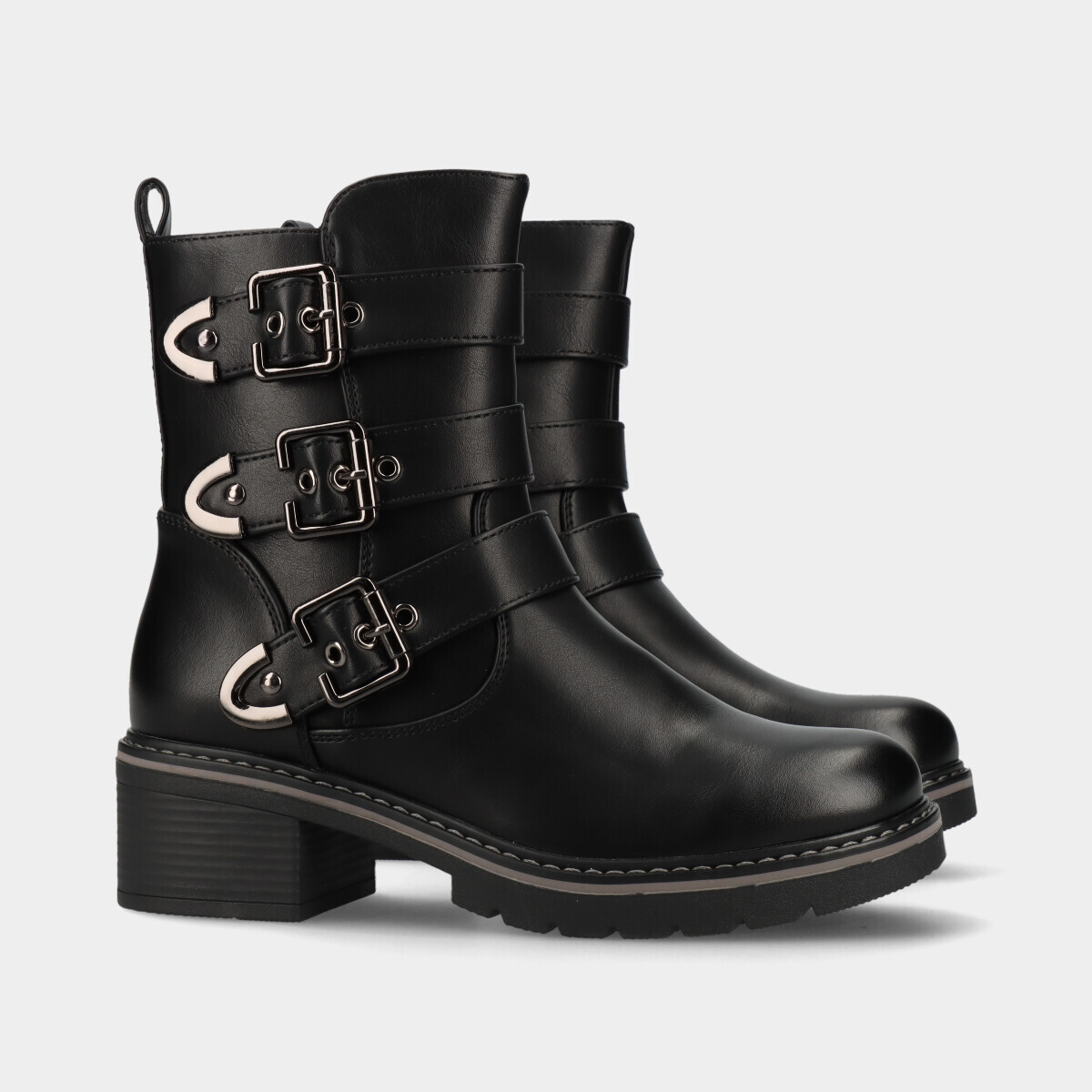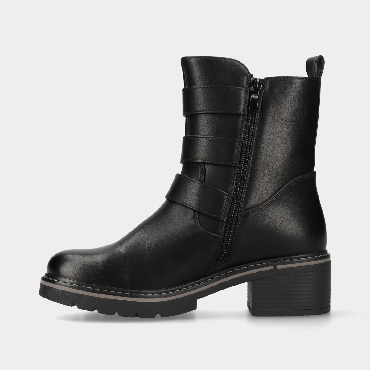 Botim de mulher em preto com efeito pele, de cano com fivelas decorativas. Fecho na lateral interior que facilita o calçar e tacão em bloco para maior conforto.