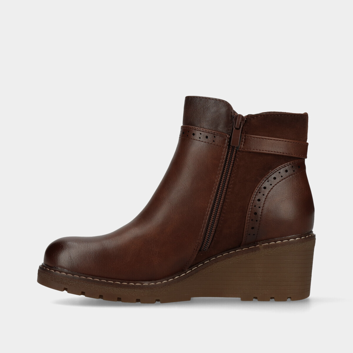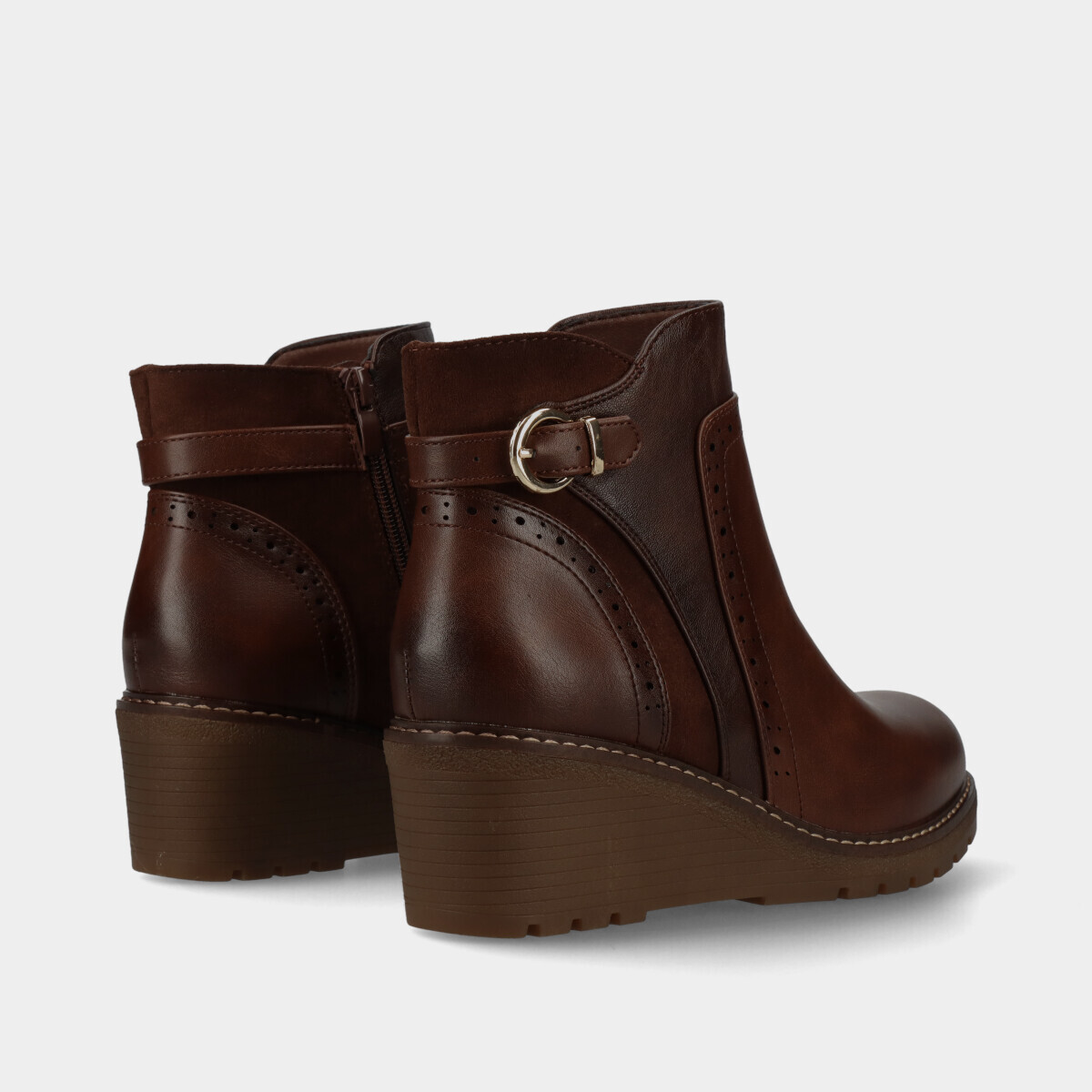 Botas para mulher em castanho com frente redonda. Fecho lateral que facilita o calçar e tacão em cunha para maior conforto.