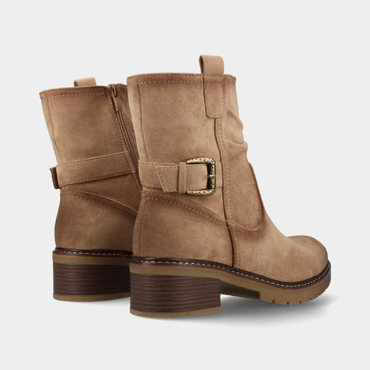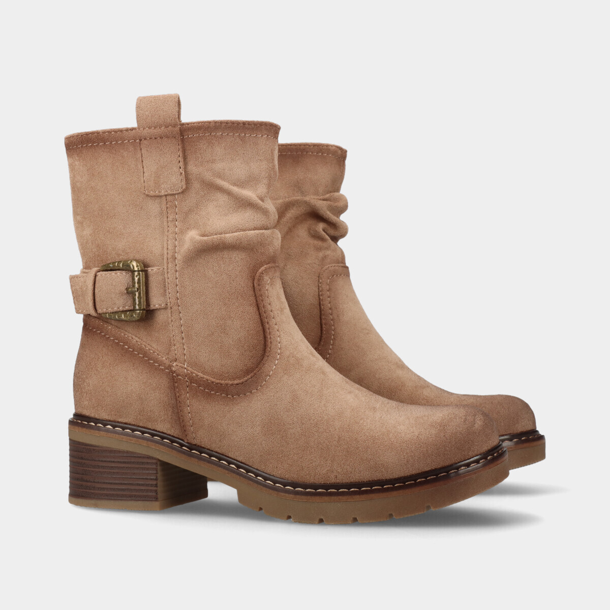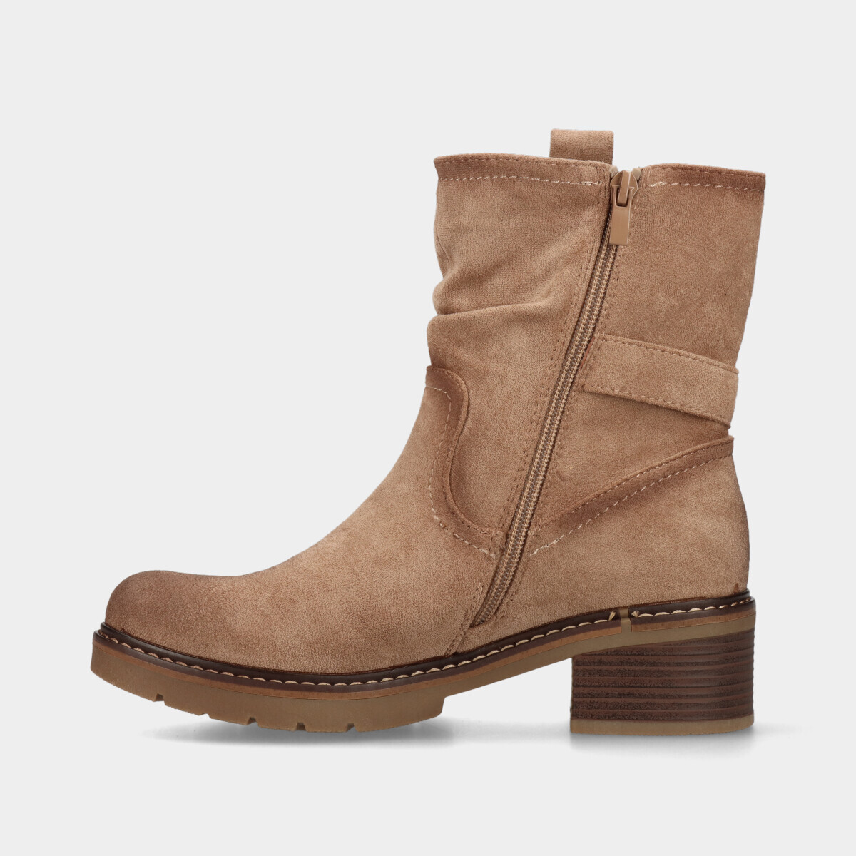 Botim de mulher em taupe com efeito camurça, de cano com fivela decorativa. Fecho na lateral interior que facilita o calçar e tacão em bloco para maior conforto.