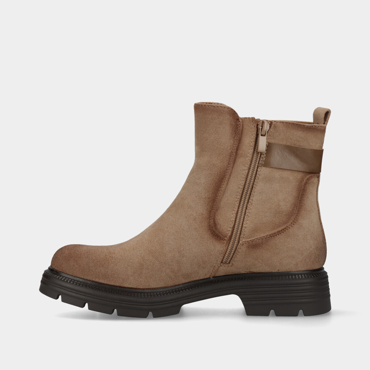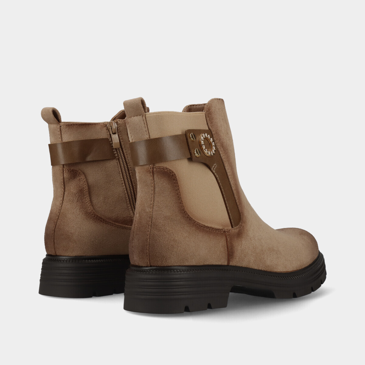 Botas para mulher em taupe com design moderno, efeito camurça, sola grossa e tratorada, elástico e fecho lateral, confortáveis para o dia a dia.