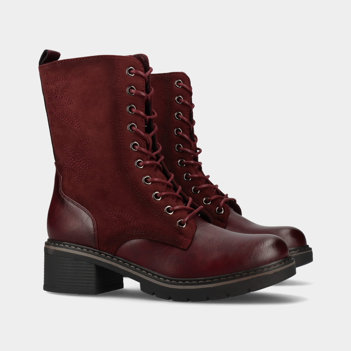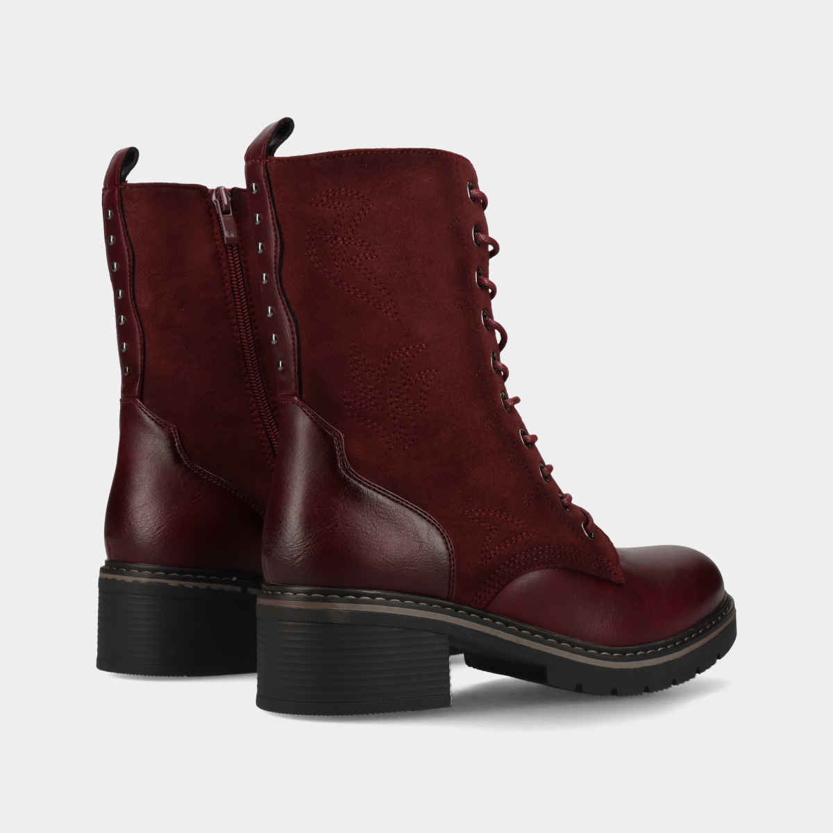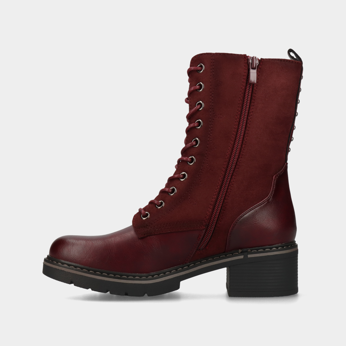 Botim de mulher em bordô com duas texturas, cordão e fecho na lateral interior que facilita o calçar.
