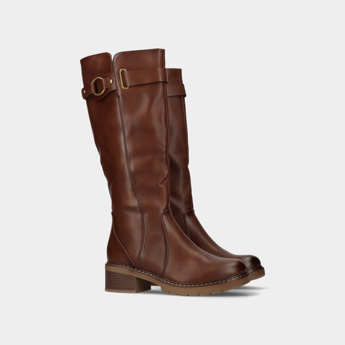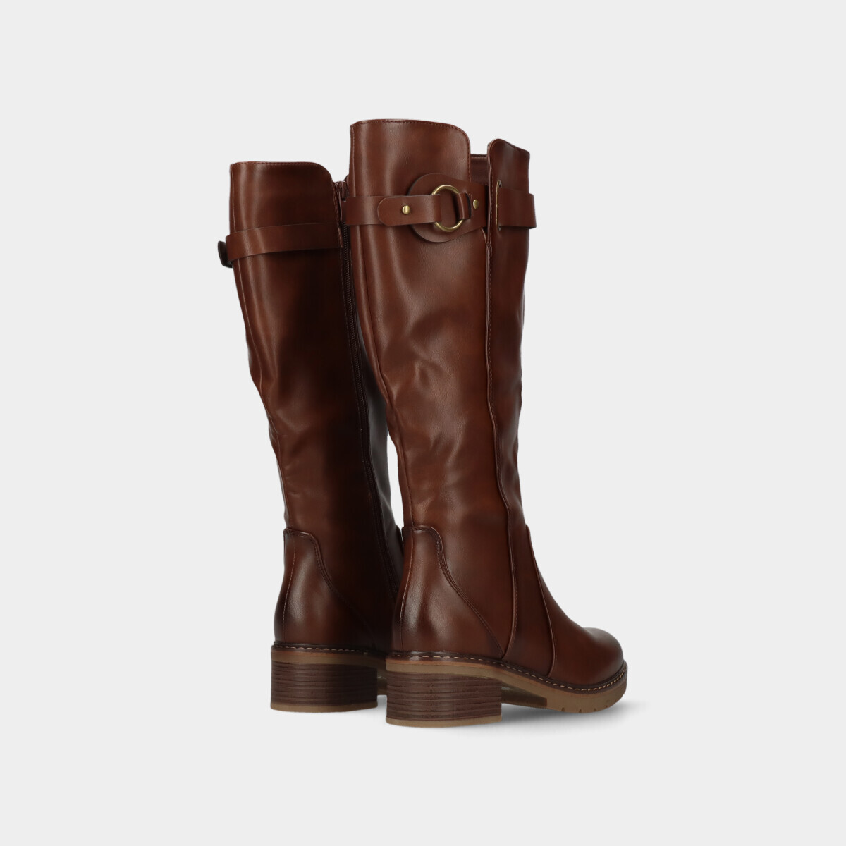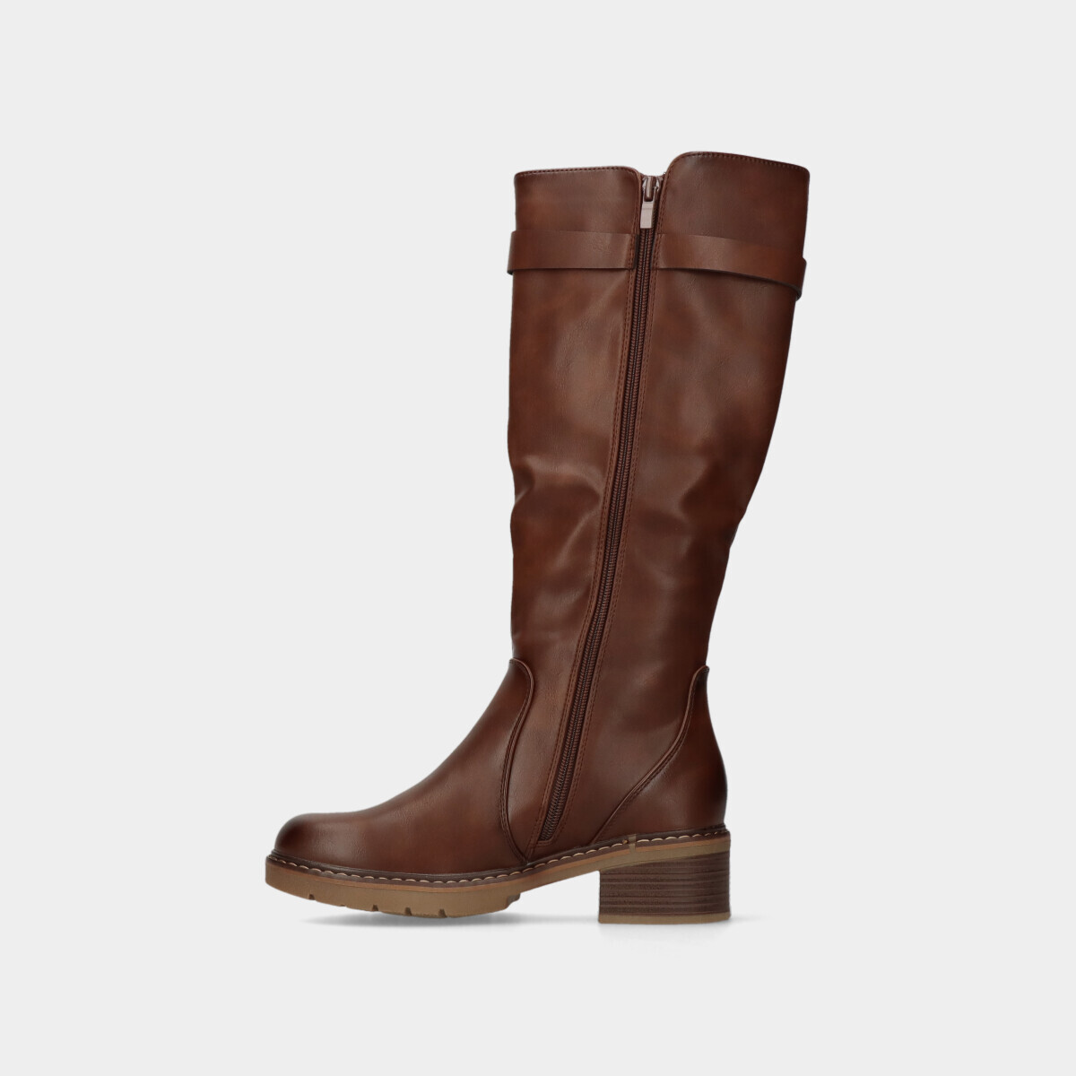 Botas para mulher em castanho com frente redonda. Fecho lateral que facilita o calçar e tacão baixo em bloco para maior conforto.