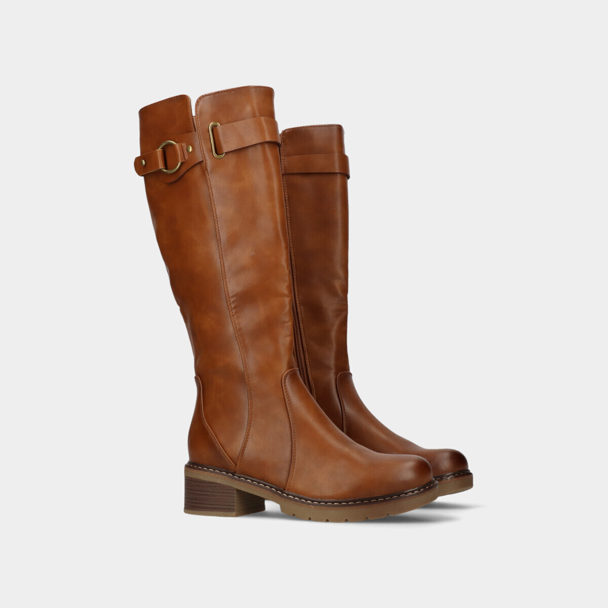 Botas para mulher em camel com frente redonda. Fecho lateral que facilita o calçar e tacão baixo em bloco para maior conforto.