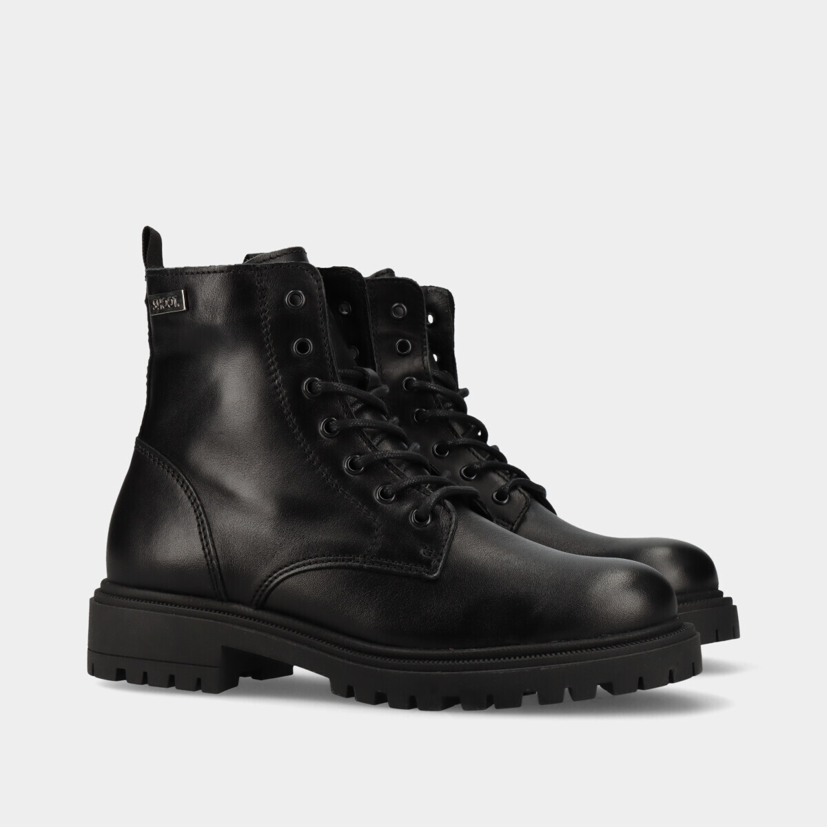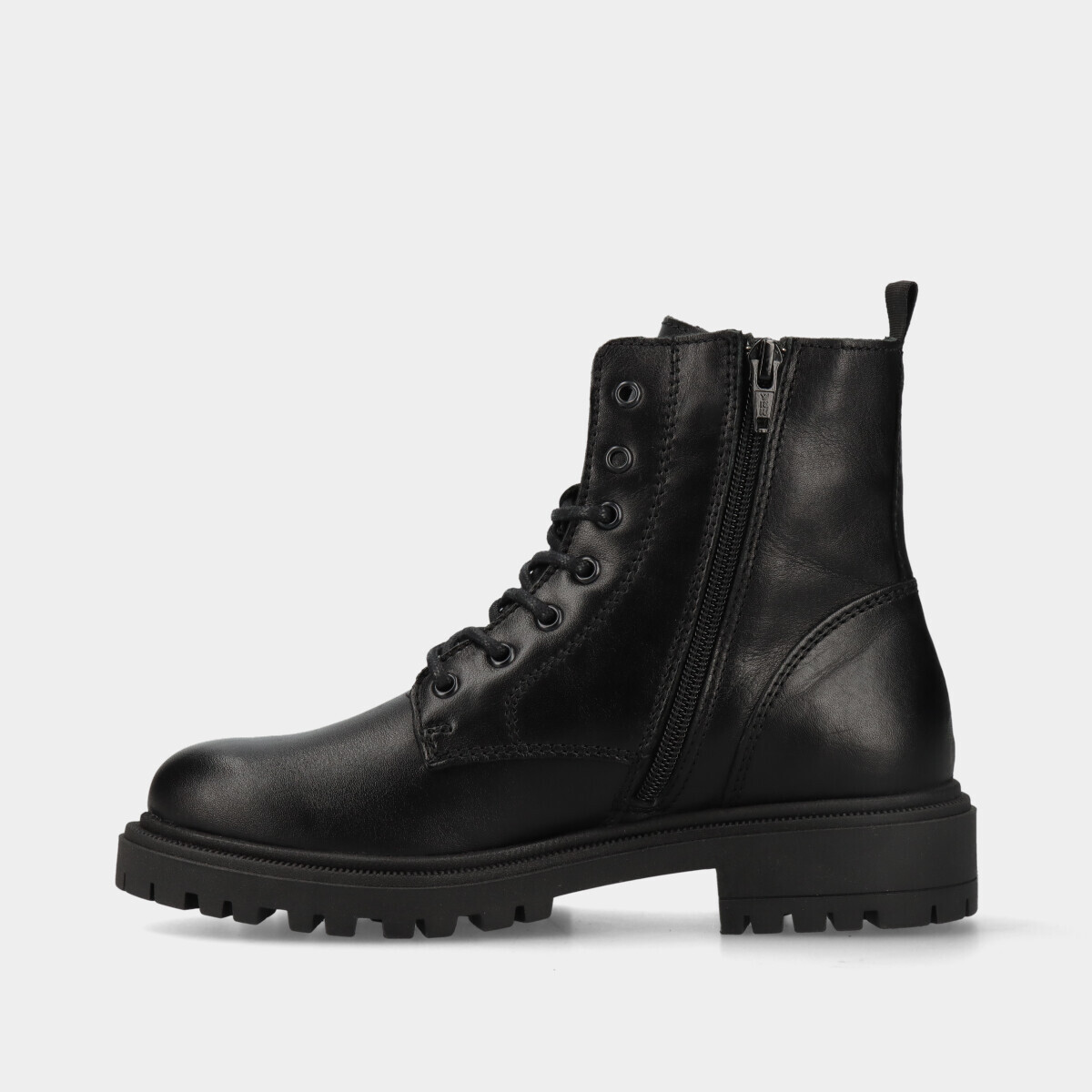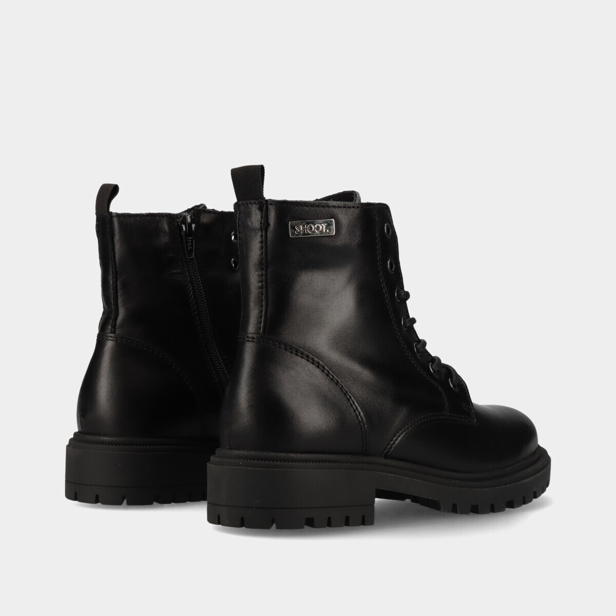 Botins estilo militar em pele preta para mulher, com forro confortável, sola de borracha robusta, atacadores e fecho. Práticos e de qualidade nacional, ideais para o dia a dia.