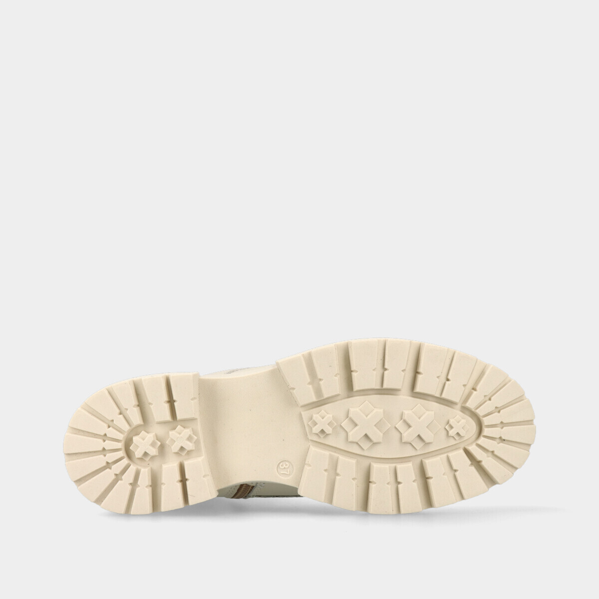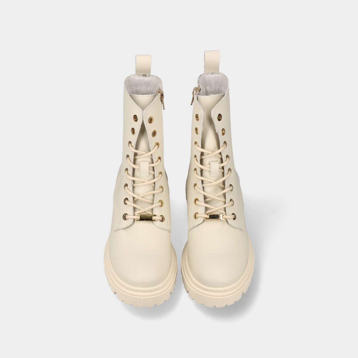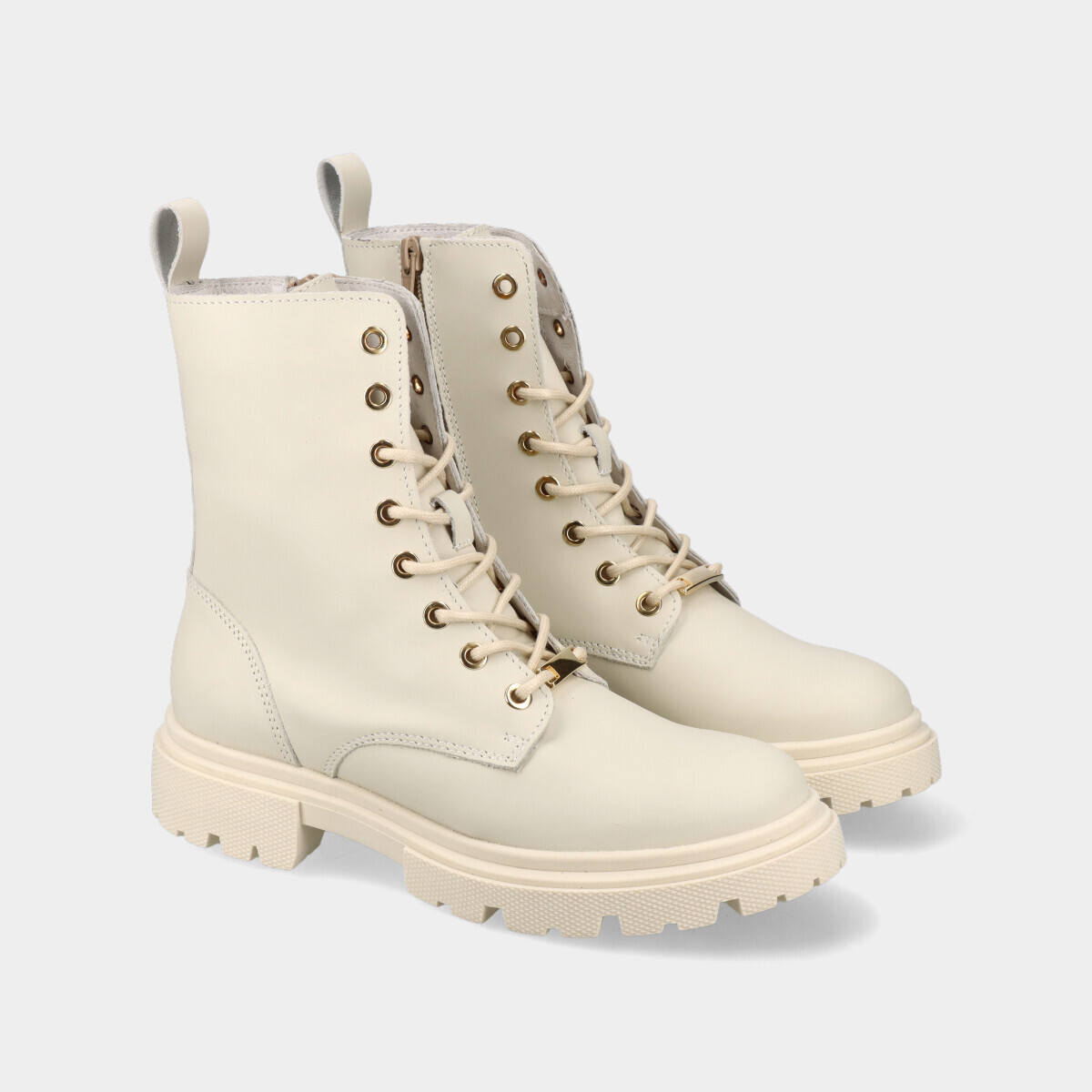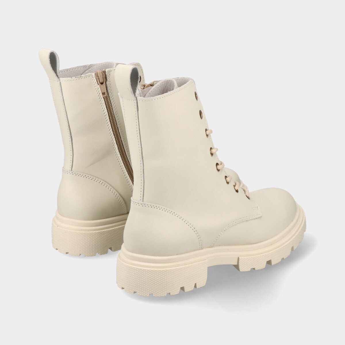Botins estilo militar em pele off-white para mulher, com palmilha confortável, sola de borracha robusta, atacadores e fecho. Práticos e de qualidade nacional, ideais para o dia a dia.