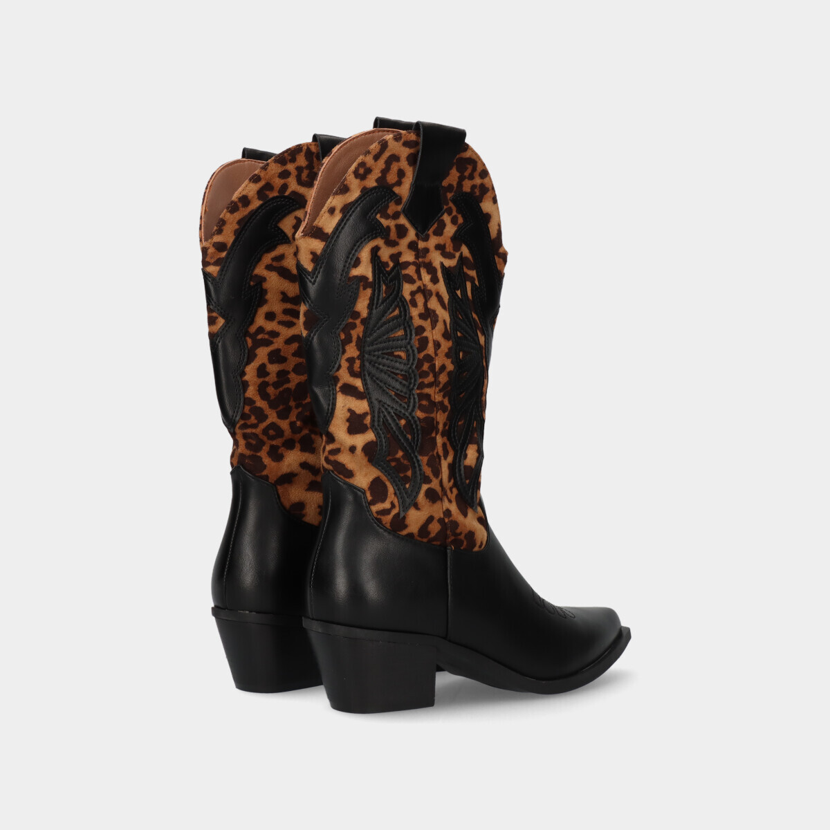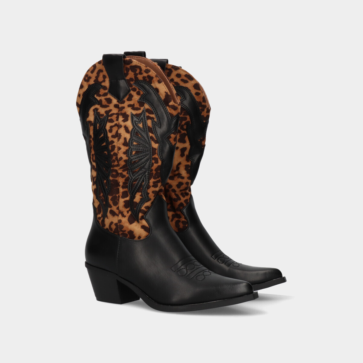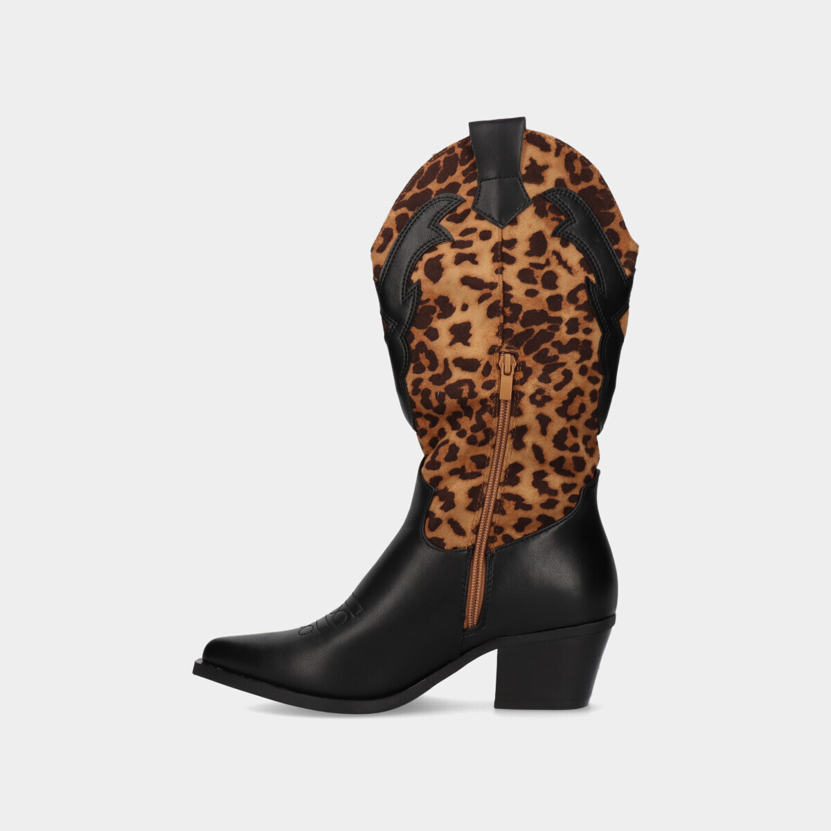 Botas texanas na cor preta e padrão leopardo, de cano alto com efeito camurça. Fecho interior que facilita o calçar e tacão médio para maior conforto.