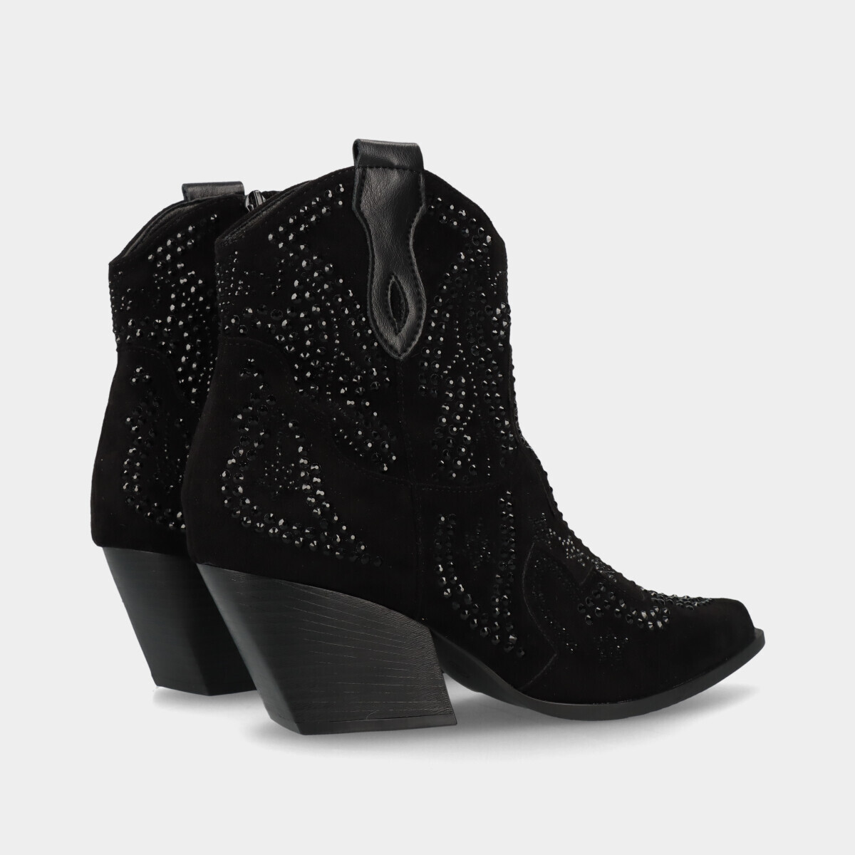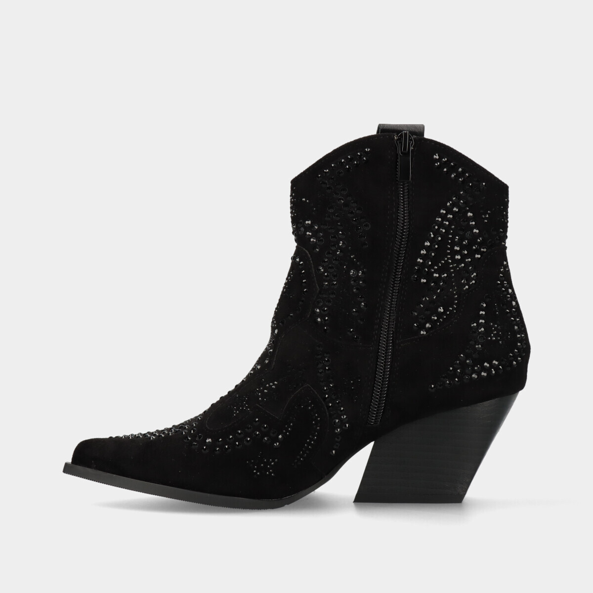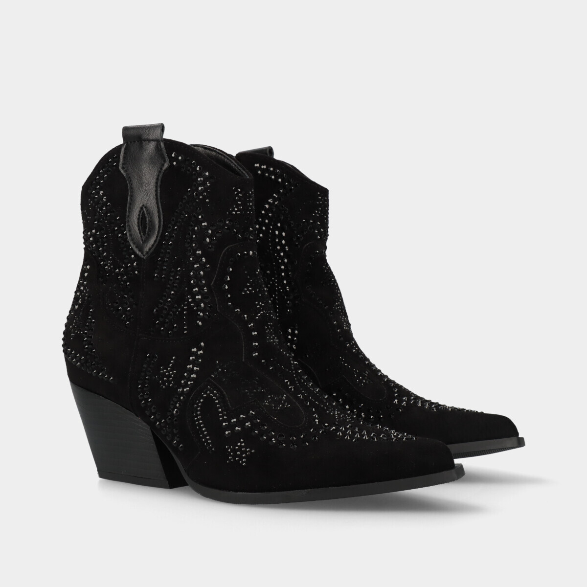 Botas em camurça de inspiração western, com aplicações de tachas pretas que acrescentam brilho e modernidade. De bico fino e salto bloco em madeira, oferecem conforto, estabilidade e muito estilo, ideais tanto para looks casuais como para combinações mais arrojadas.