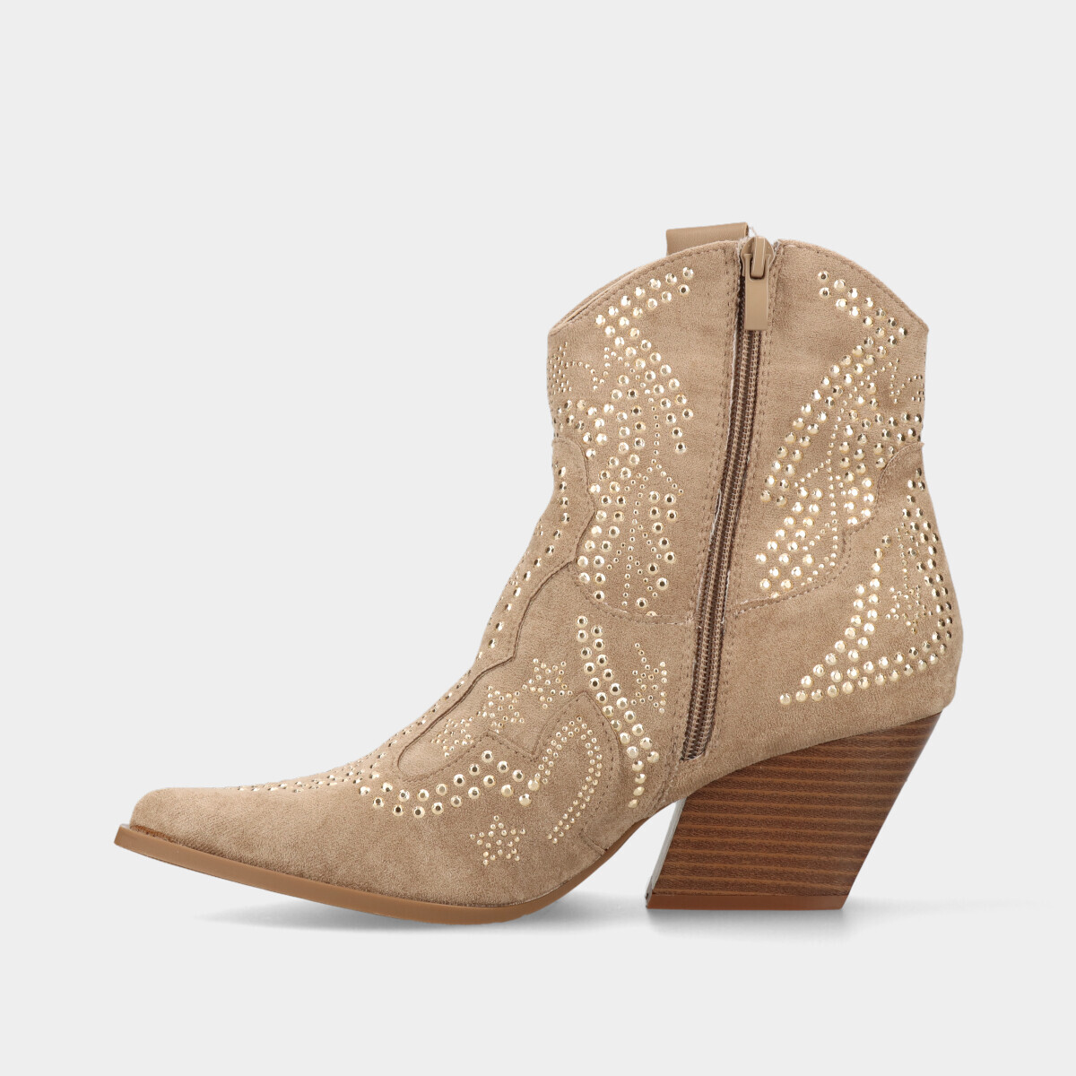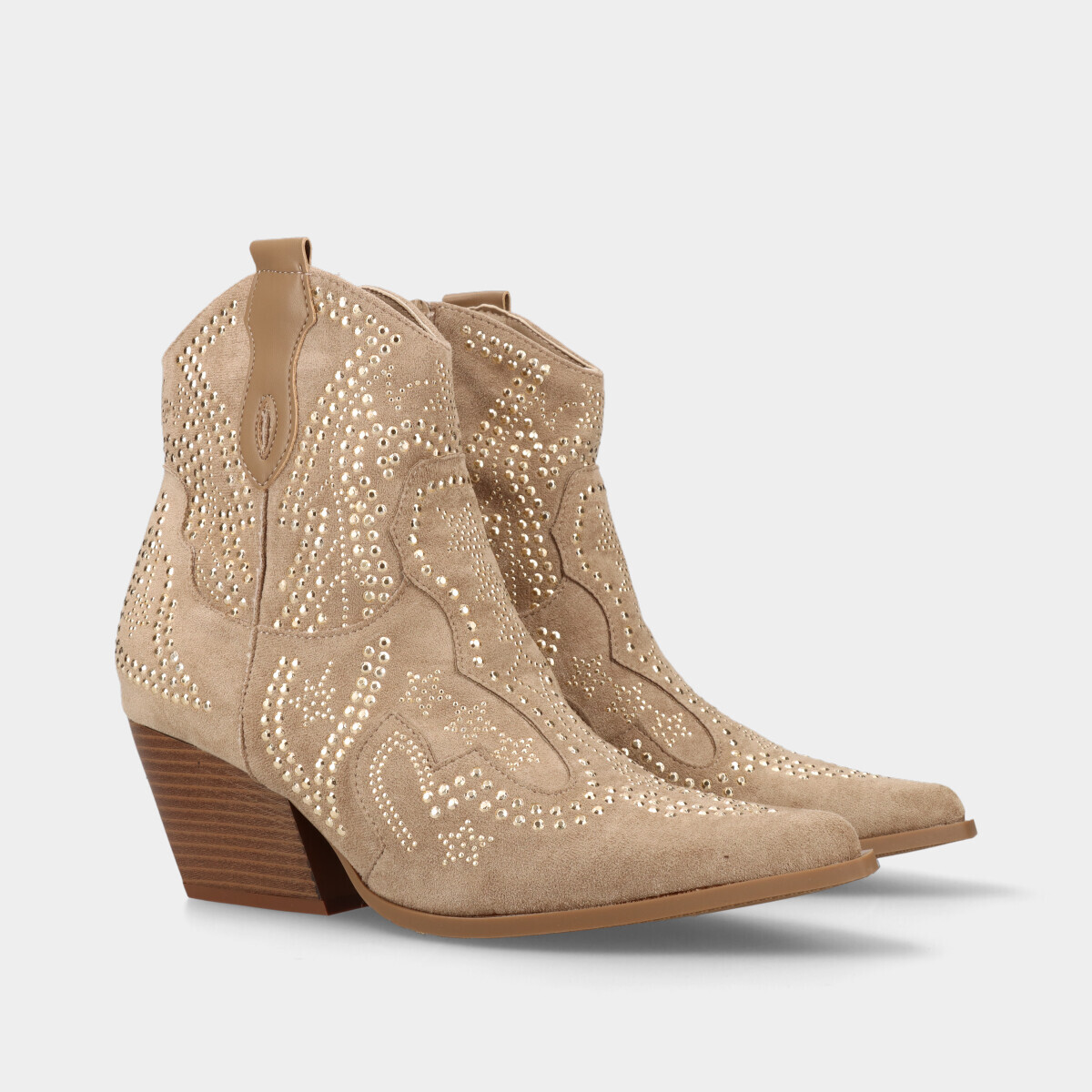 Botas em camurça de inspiração western, com aplicações de tachas douradas que acrescentam brilho e modernidade. De bico fino e salto bloco em madeira, oferecem conforto, estabilidade e muito estilo, ideais tanto para looks casuais como para combinações mais arrojadas.