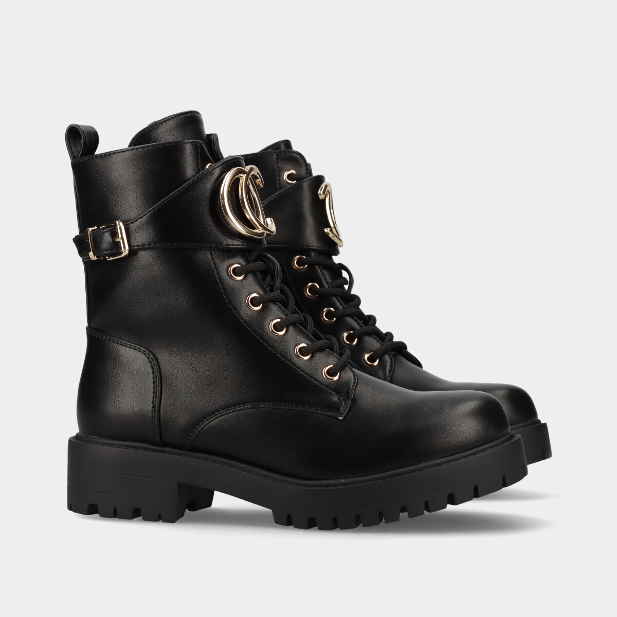Botas para mulher em preto com design moderno em efeito pele, atacadores e fecho lateral, leves e confortáveis para o dia a dia.