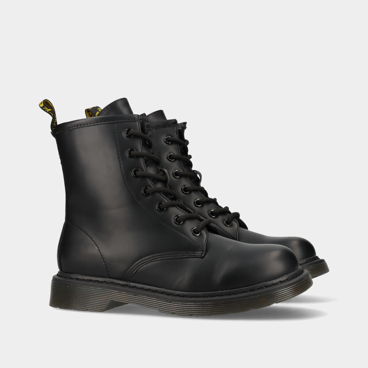 Botas para mulher em preto com efeito pele, cordão e fecho lateral, leves e confortáveis para o dia a dia.