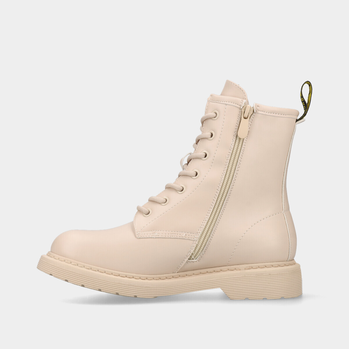 Botas para mulher em bege com efeito pele, cordão e fecho lateral, leves e confortáveis para o dia a dia.