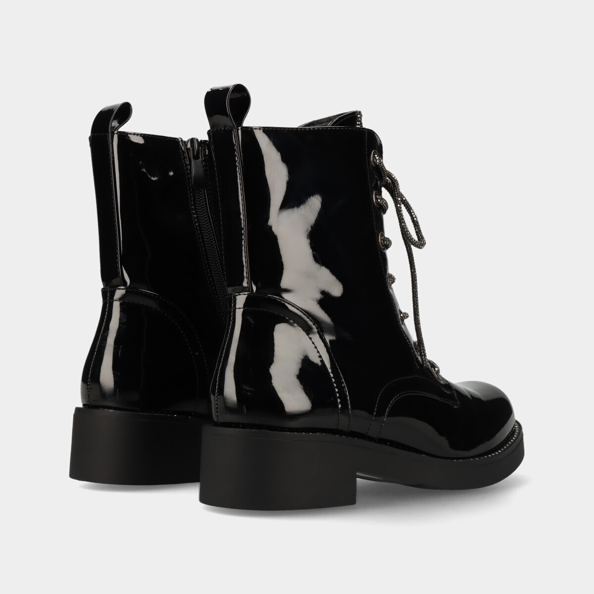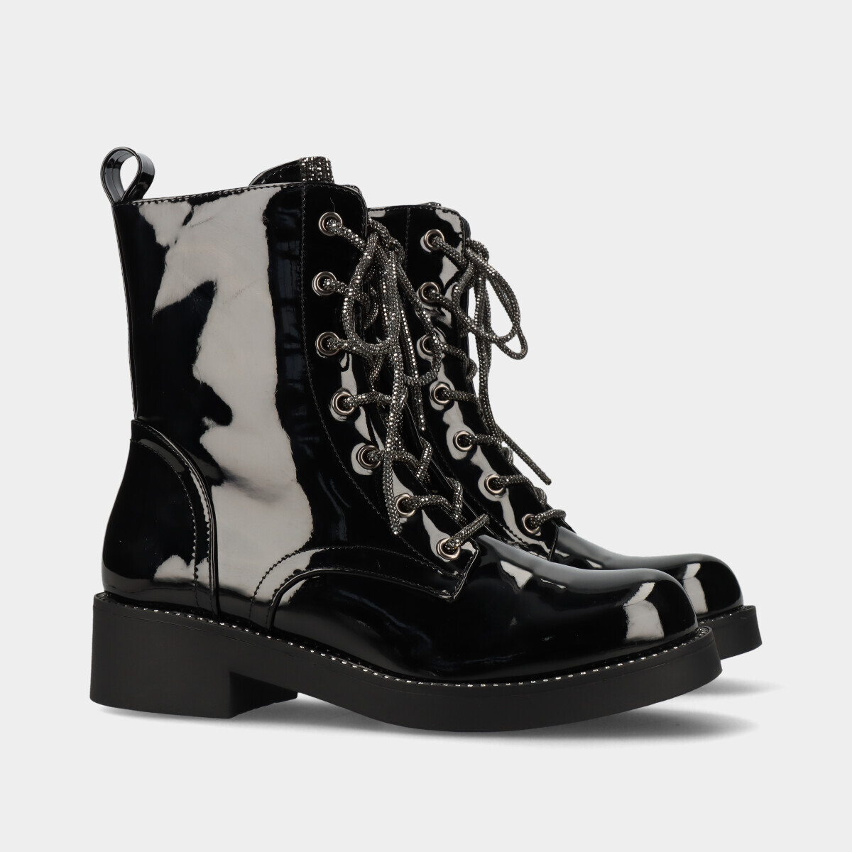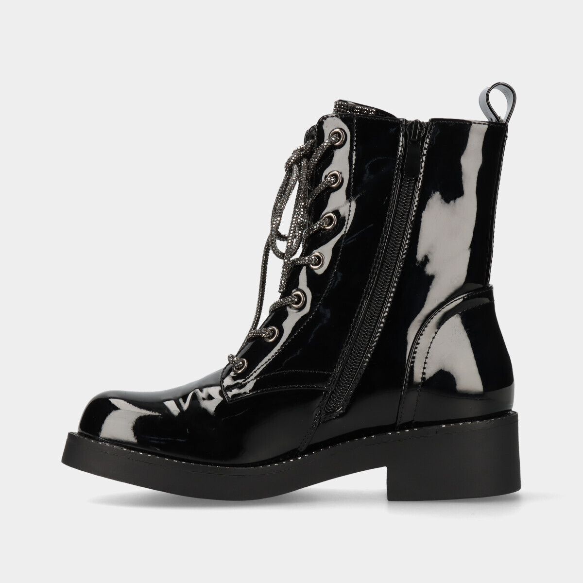 Botim de mulher em preto com efeito verniz, de cano com atacadores e pala de brilhantes. Fecho na lateral interior que facilita o calçar e tacão em bloco para maior conforto.