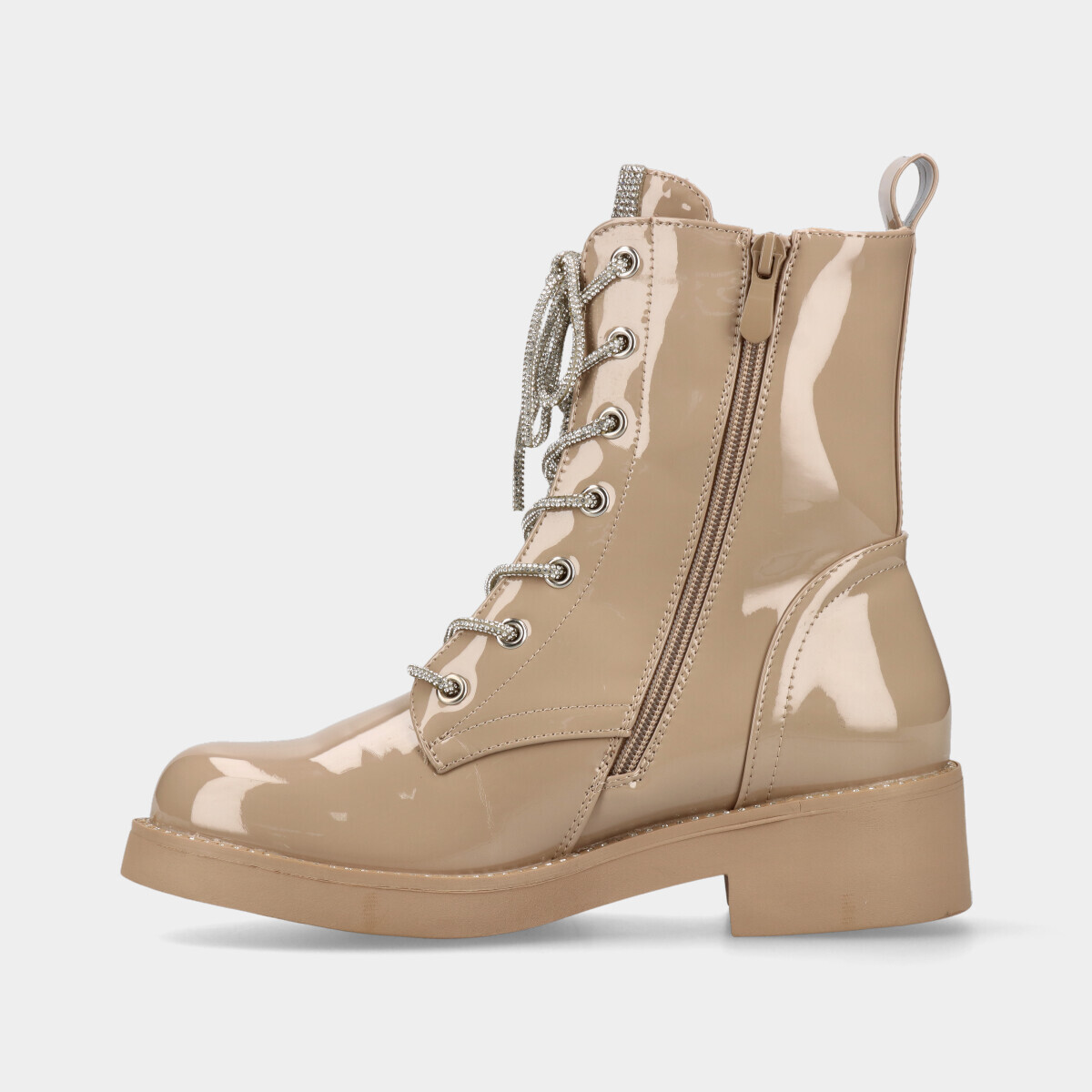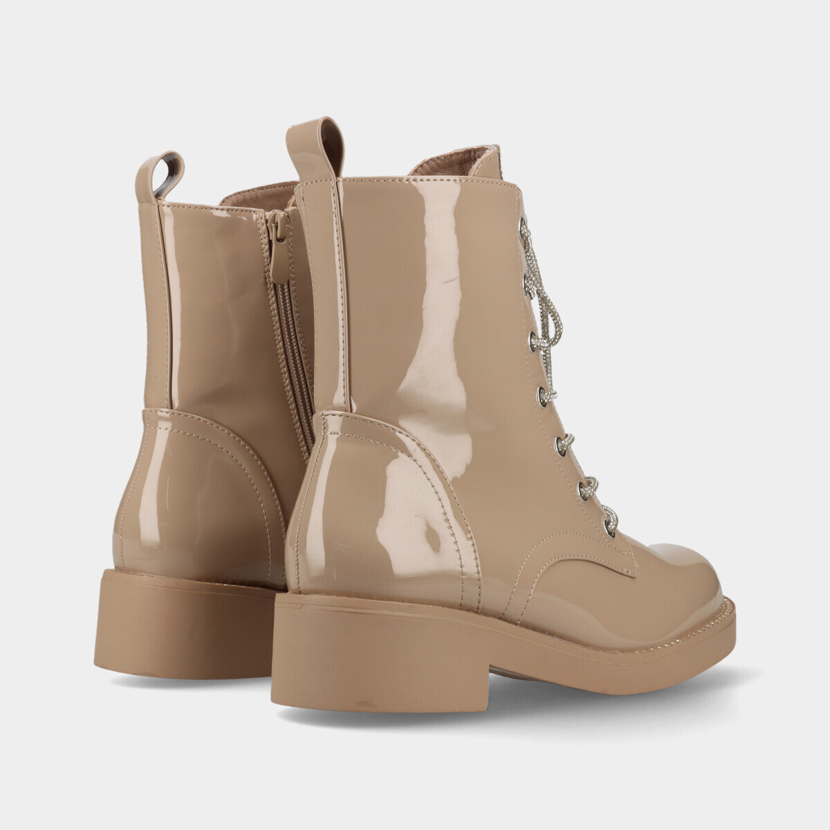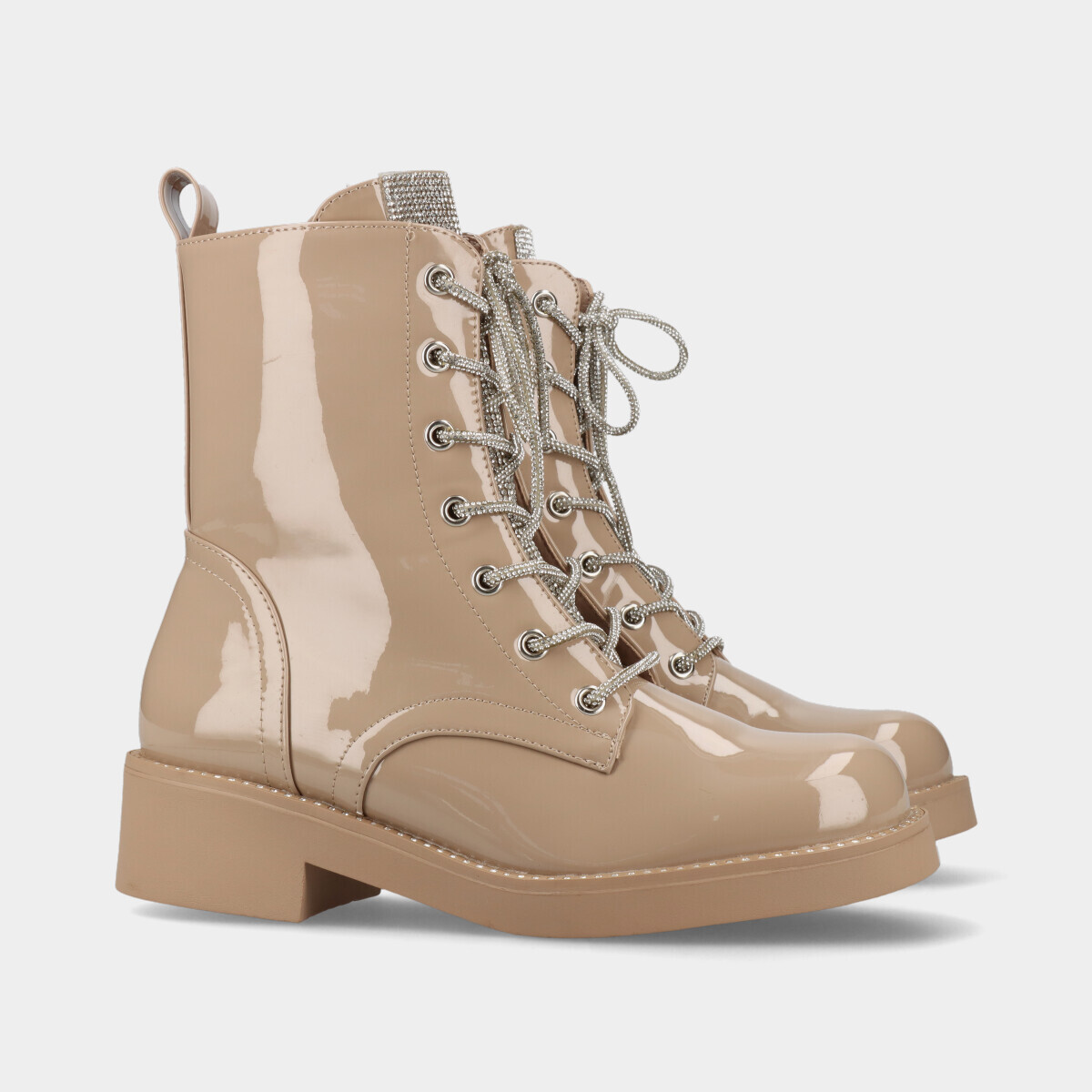 Botim de mulher em bege com efeito verniz, de cano com atacadores e pala de brilhantes. Fecho na lateral interior que facilita o calçar e tacão em bloco para maior conforto.