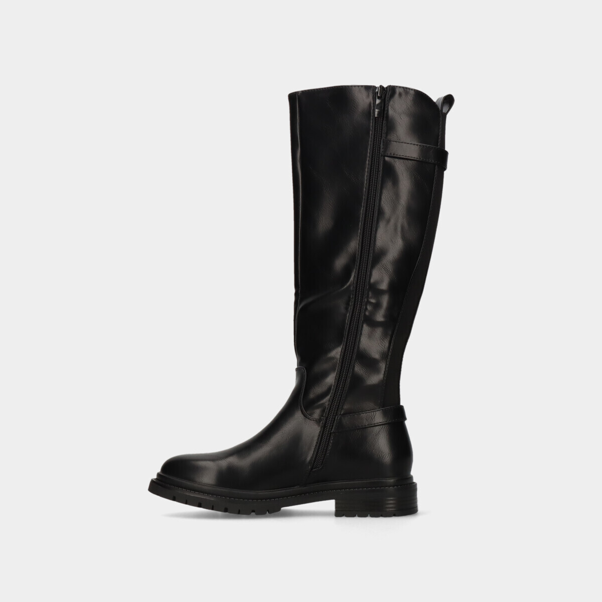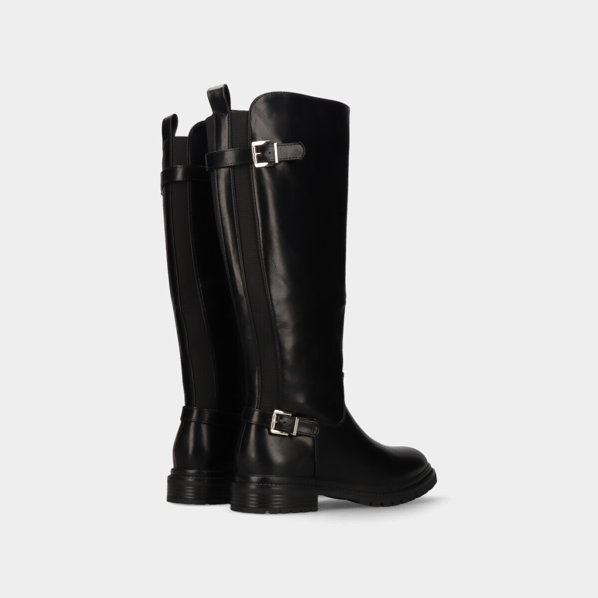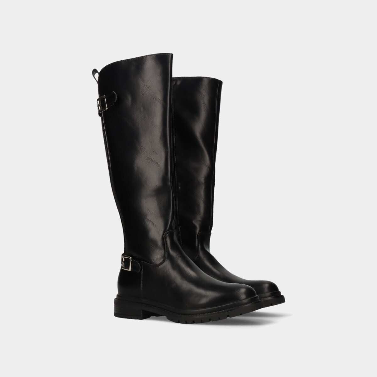 Botas para mulher em preto, com efeito pele, biqueira redonda, fivelas prateadas, elásticos e fecho lateral, garantindo um ajuste perfeito e facilidade ao calçar.