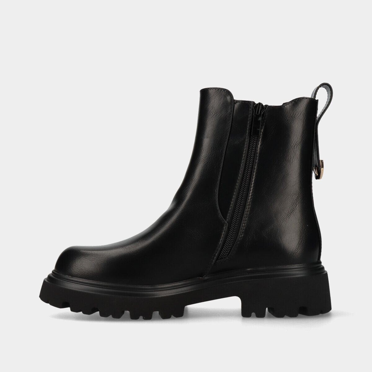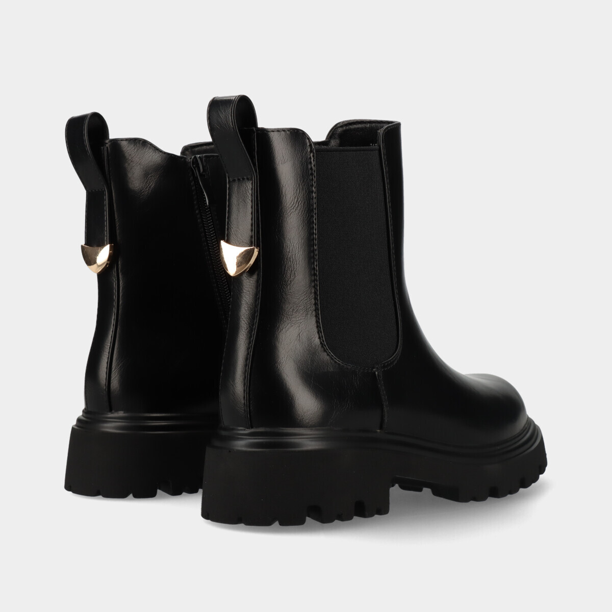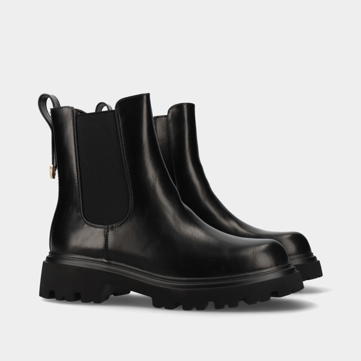 Botas para mulher em preto com design moderno, efeito pele, sola grossa e tratorada, elástico e fecho lateral, confortáveis para o dia a dia.