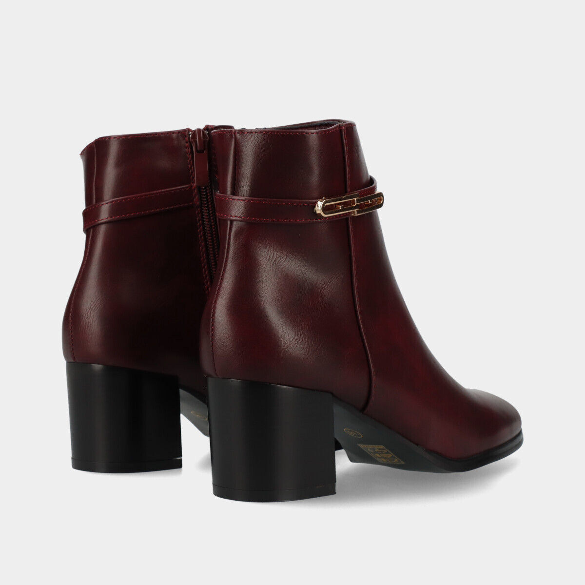Botim de salto médio para mulher em bordô com efeito pele e aplicação decorativa dourada. Palmilha acolchoada, fecho lateral que facilita o calçar e tacão largo para maior conforto e estabilidade.