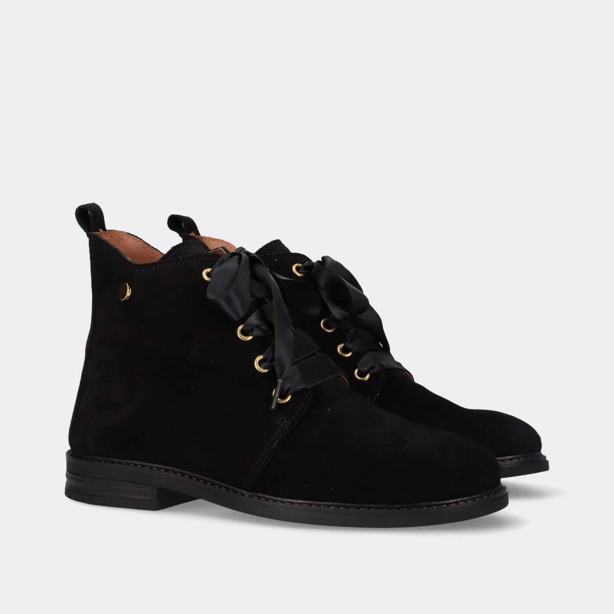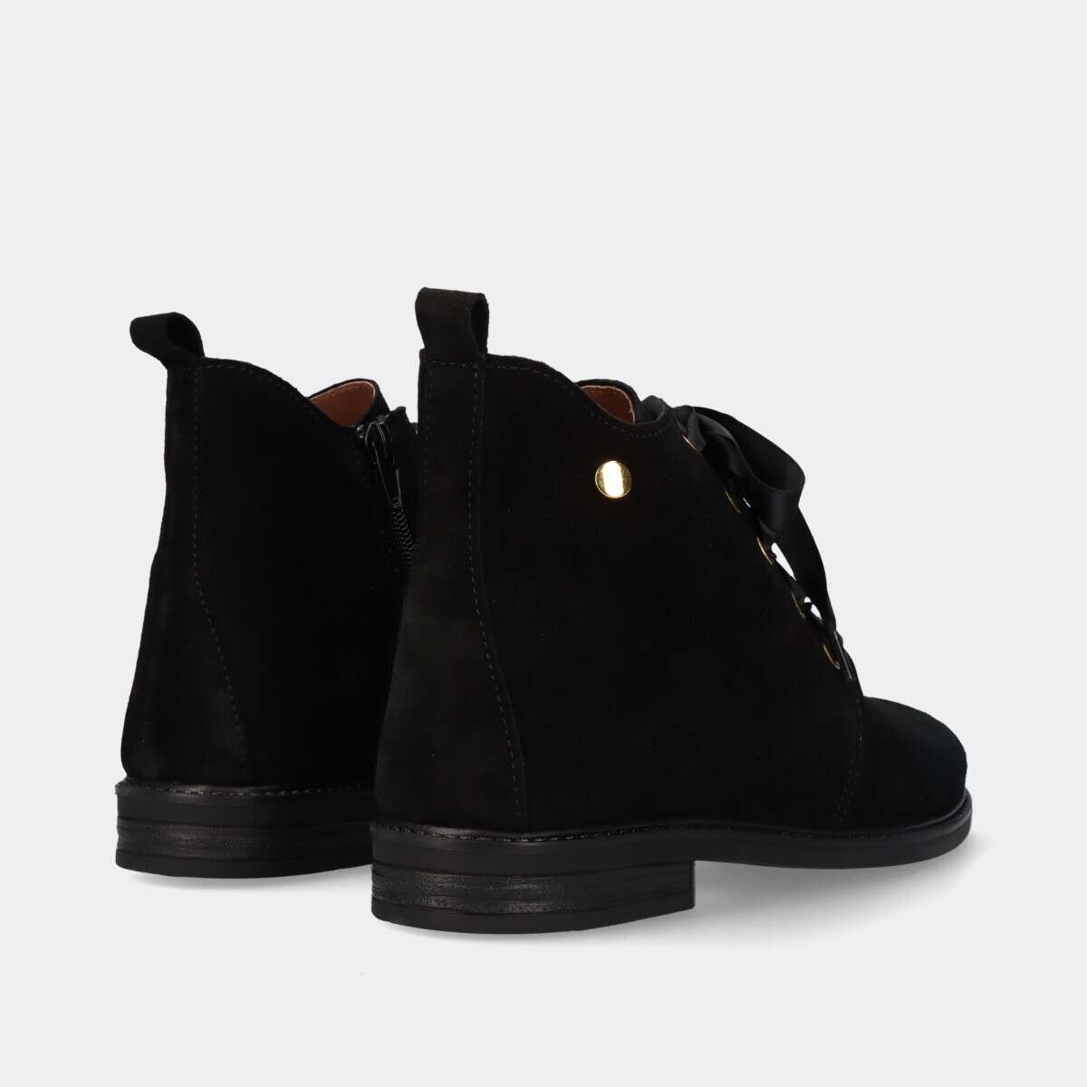 Botim na cor preta em pele camurça com cordão e fecho na lateral interior.