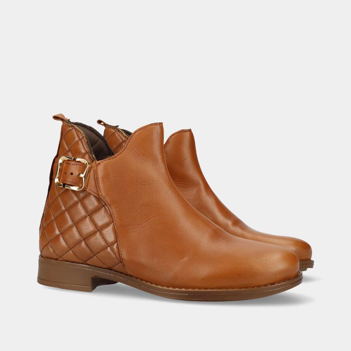 Botim em pele na cor camel com efeito acolchoado na parte de trás e fecho lateral.