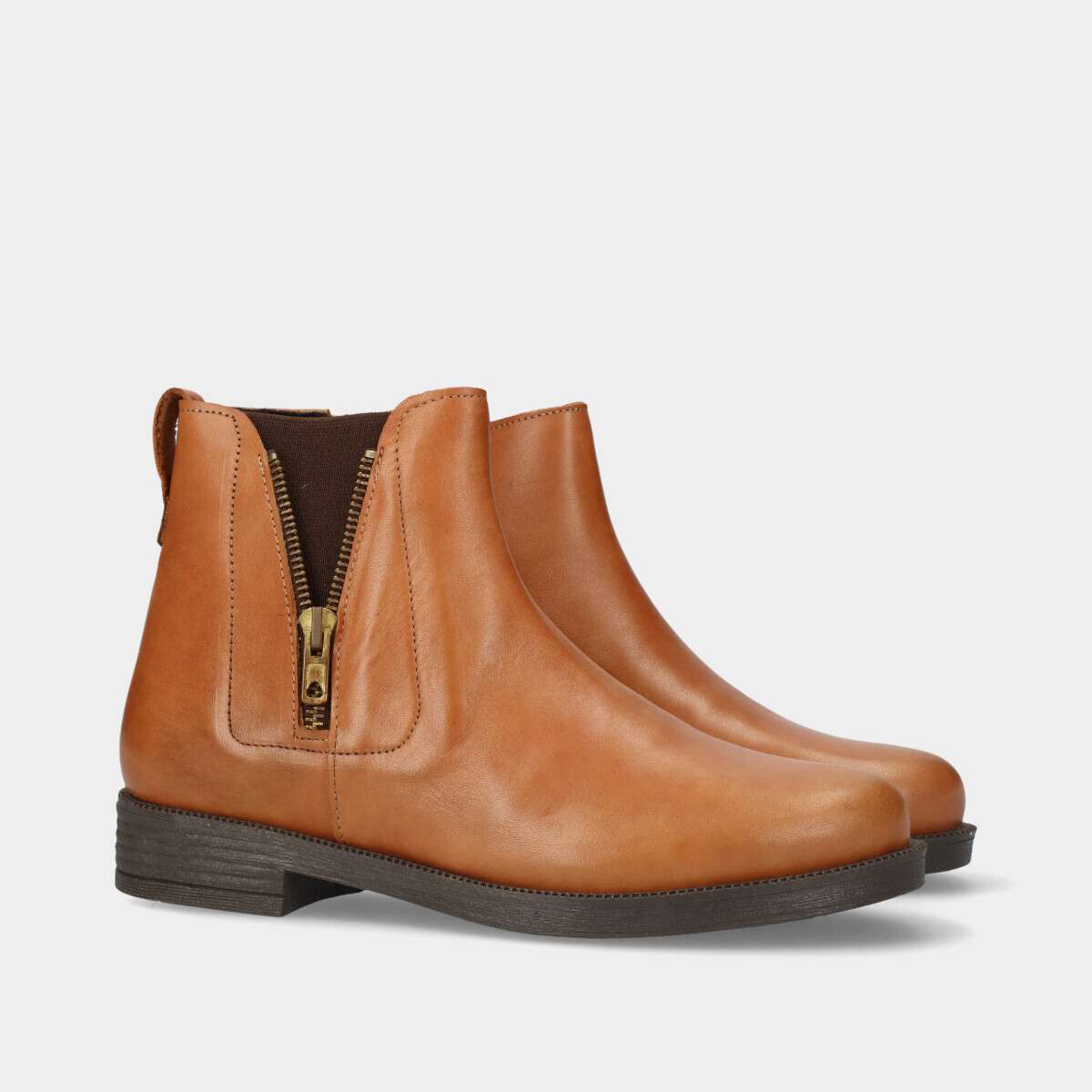 Botim na cor camel em pele com elástico na lateral exterior e fecho na lateral interior.