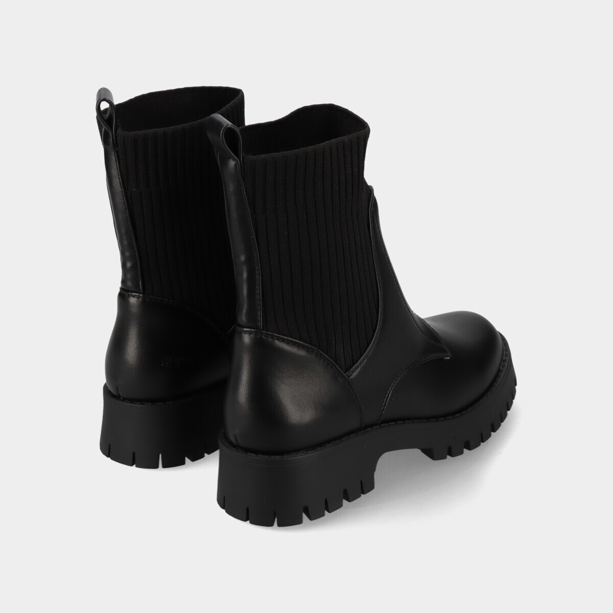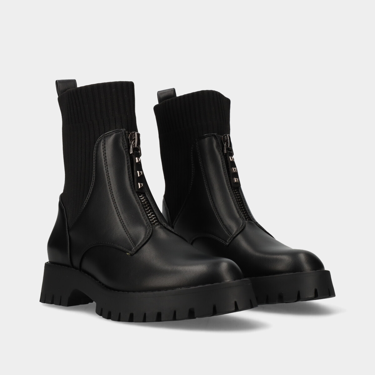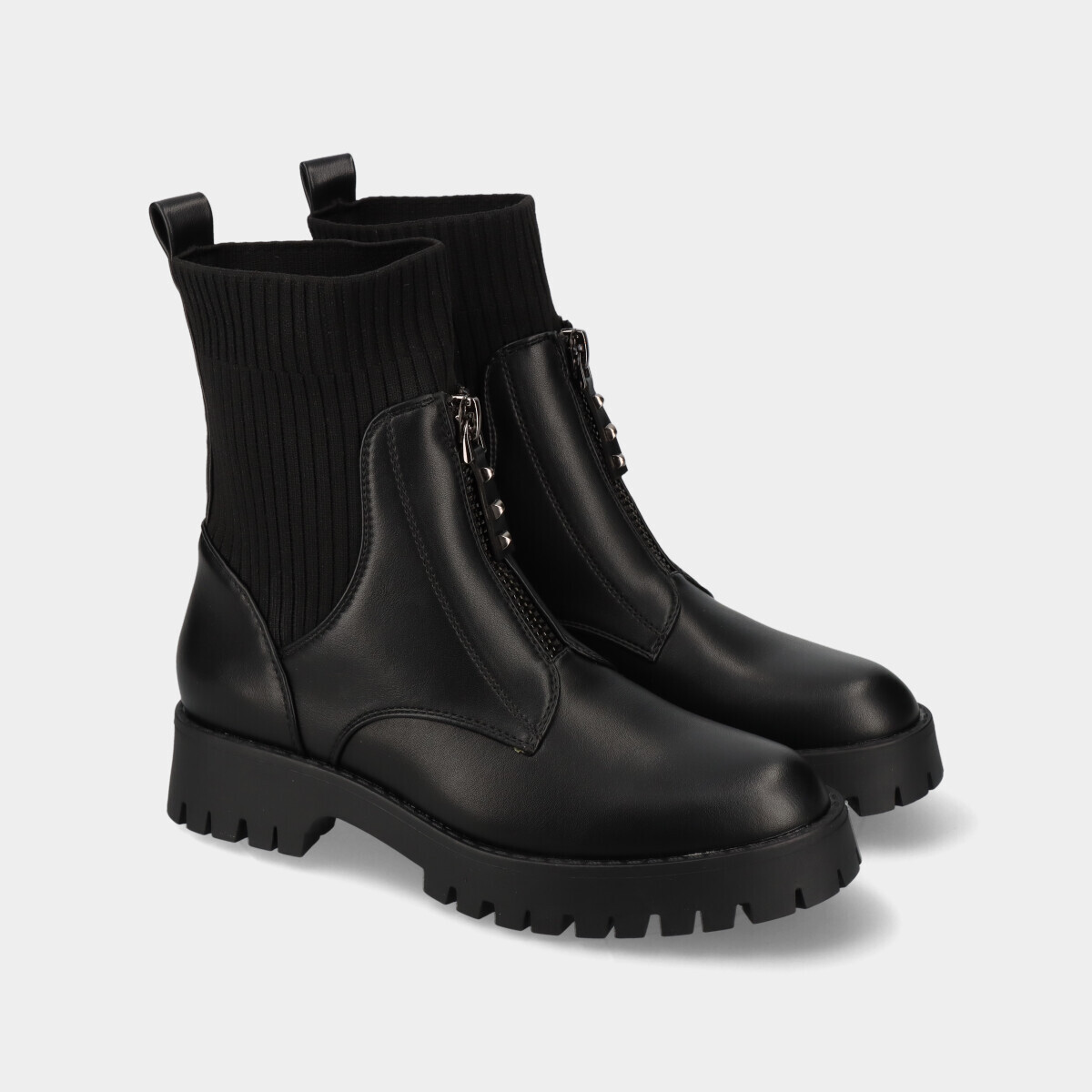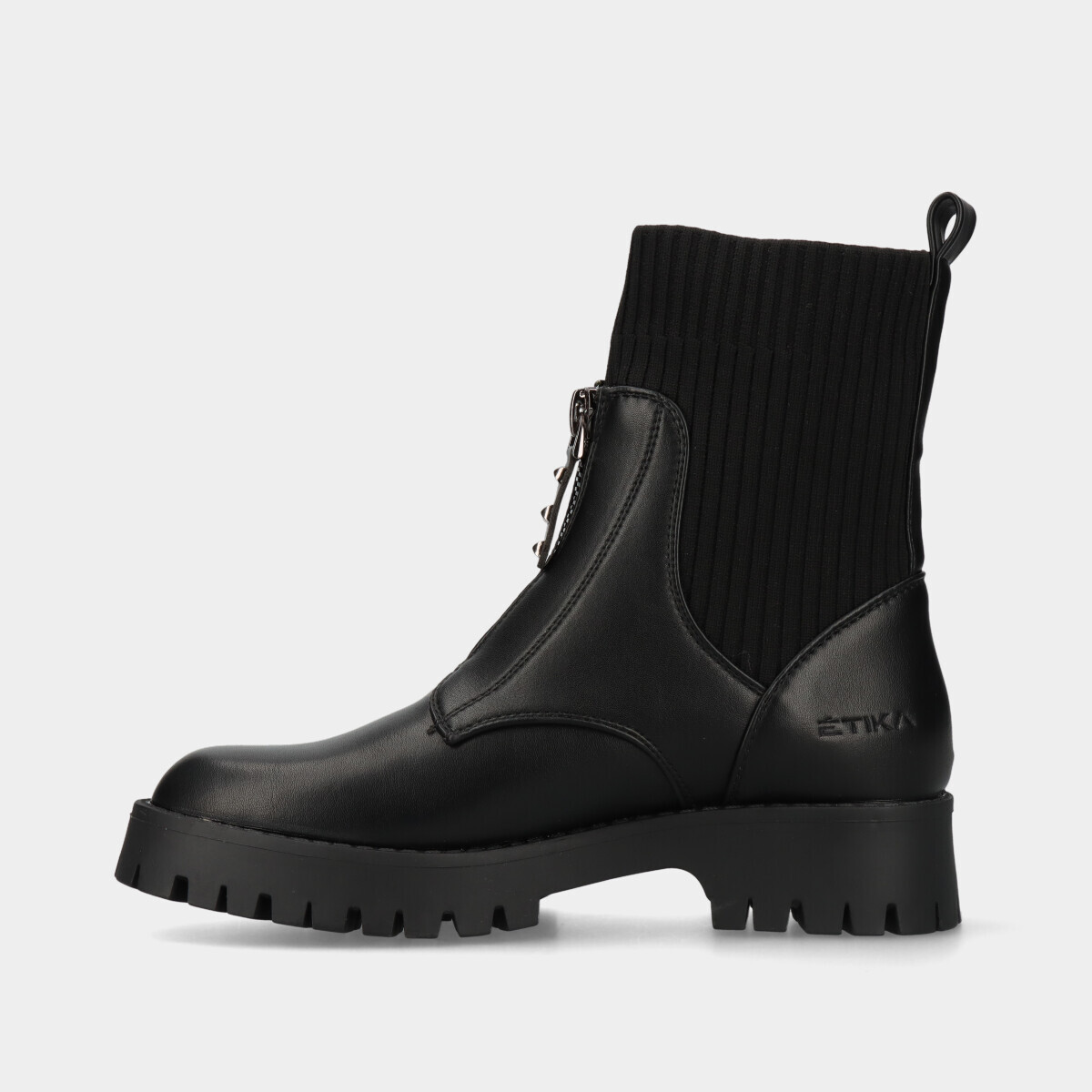 Botins estilo militar para mulher em preto, com cano estilo meia elástica, biqueira redonda, fecho frontal decorativo e design confortável, ideais para uso diário com estilo.