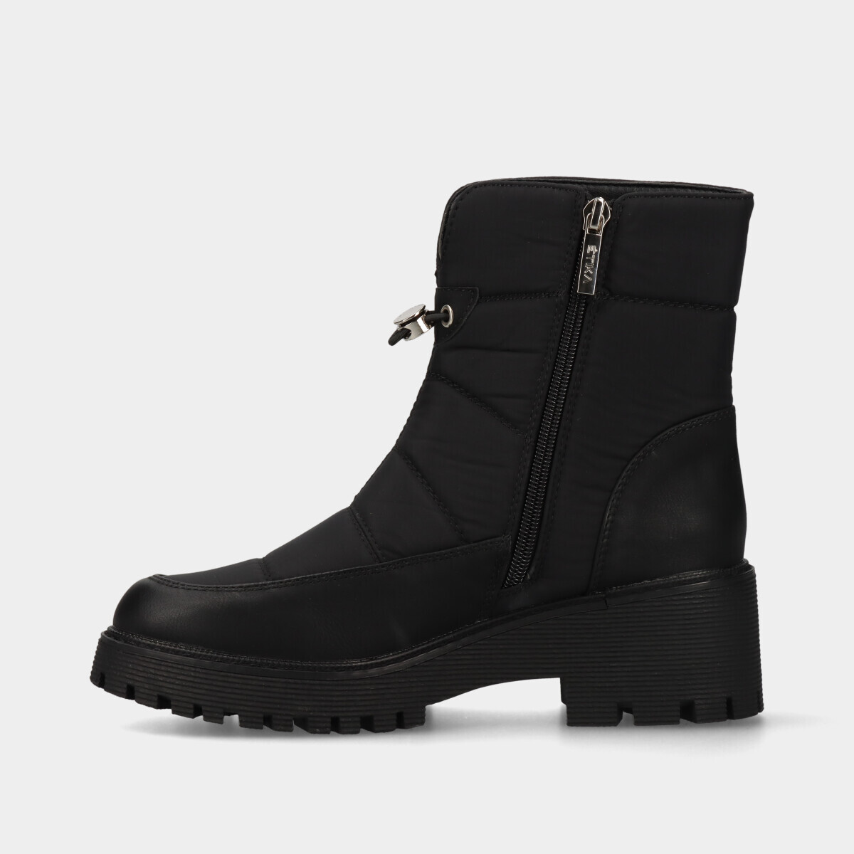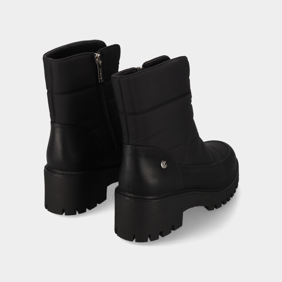 Botins acolchoados para mulher na cor preta, confortáveis, práticos e estilosos, com design moderno e original. Sola robusta e resistente, forro macio e quente, fecho lateral fácil de usar. Ideais para uso diário, proporcionando conforto e mantendo os pés quentes com estilo.