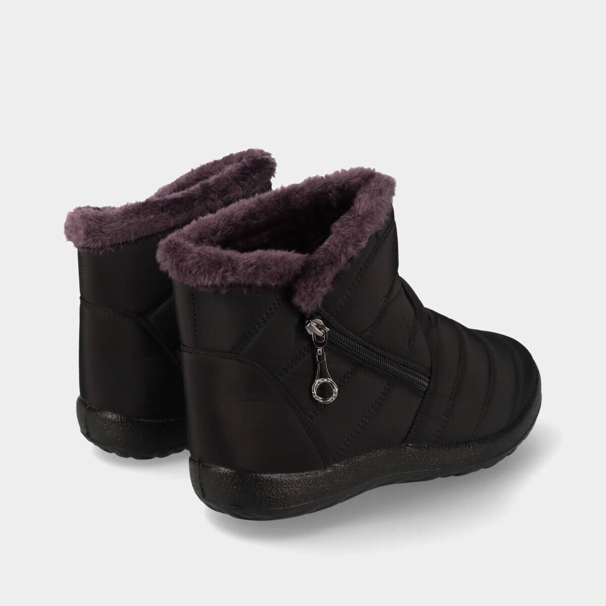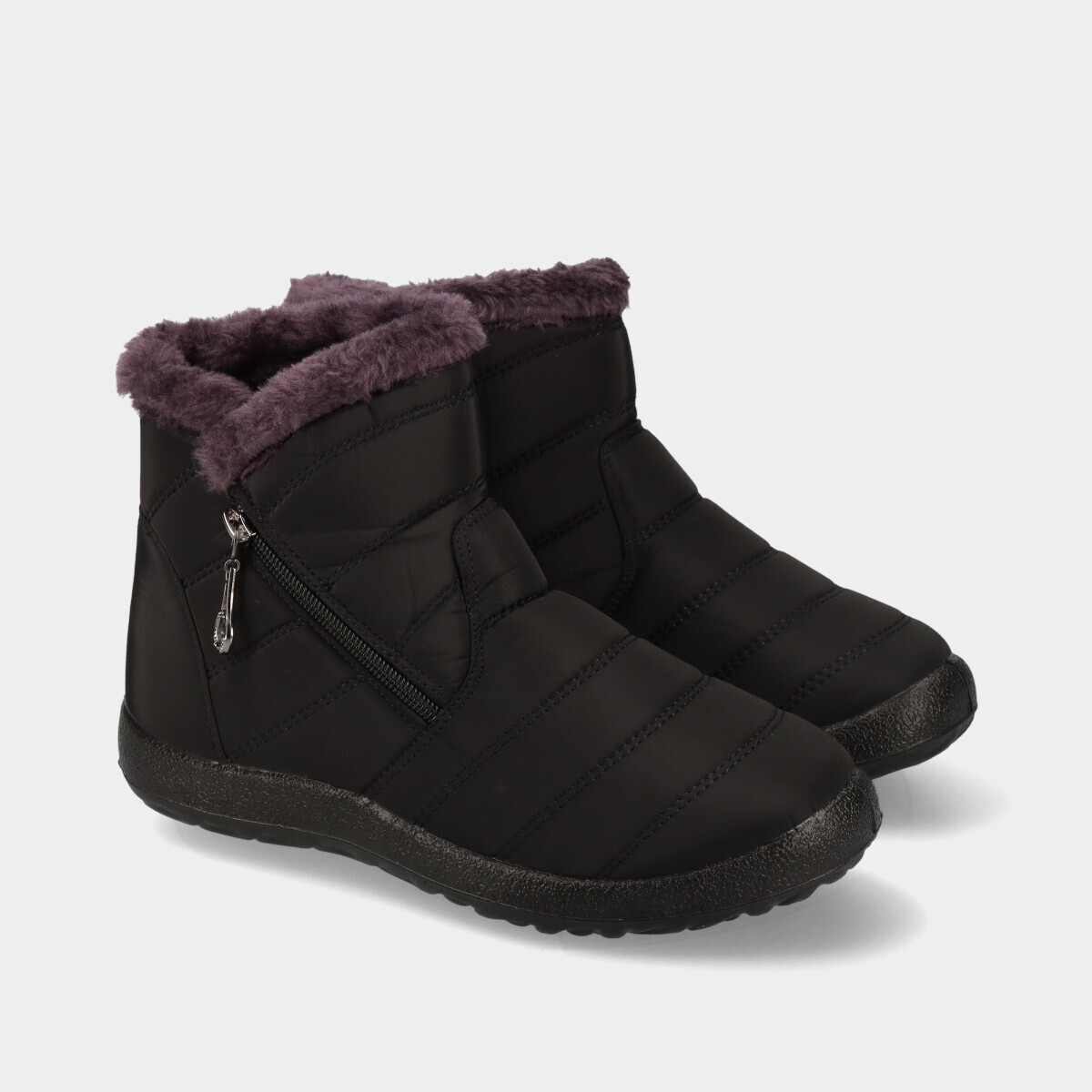 Botins de conforto para mulher, em preto, com forro e gola quentes, fecho lateral e aplicação decorativa. Ideais para uso diário.